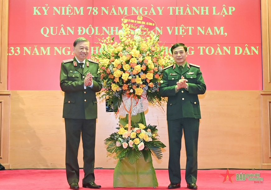 | Đại tướng Tô Lâm thay mặt Đảng ủy Công an Trung ương, lãnh đạo Bộ Công an tặng hoa chúc mừng Quân ủy Trung ương, Bộ Quốc phòng |