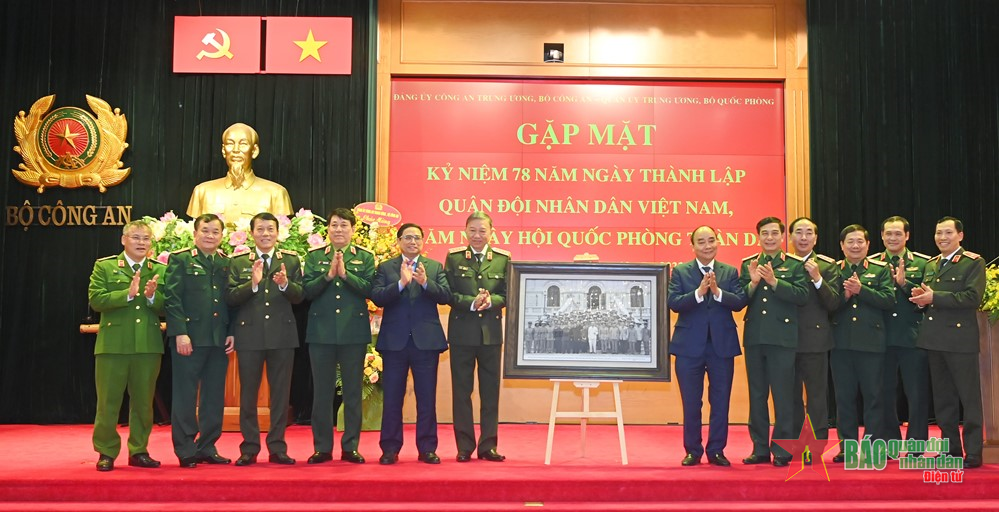 Tại buổi gặp mặt, thay mặt Đảng ủy CATƯ, lãnh đạo Bộ Công an, Đại tướng Tô Lâm gửi lời chào trân trọng và lời chúc tốt đẹp đến Chủ tịch nước Nguyễn Xuân Phúc, Thủ tướng Chính phủ Phạm Minh Chính; các đồng chí trong QUTƯ, lãnh đạo Bộ Quốc phòng, Ủy ban Quốc phòng và An ninh của Quốc hội, các sĩ quan, tướng lĩnh, cán bộ, chiến sĩ trong lực lượng QĐND nhân dịp kỷ niệm 78 năm Ngày thành lập QĐND Việt Nam và 33 năm Ngày hội Quốc phòng toàn dân.