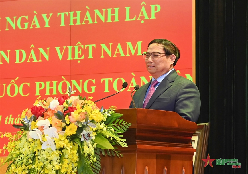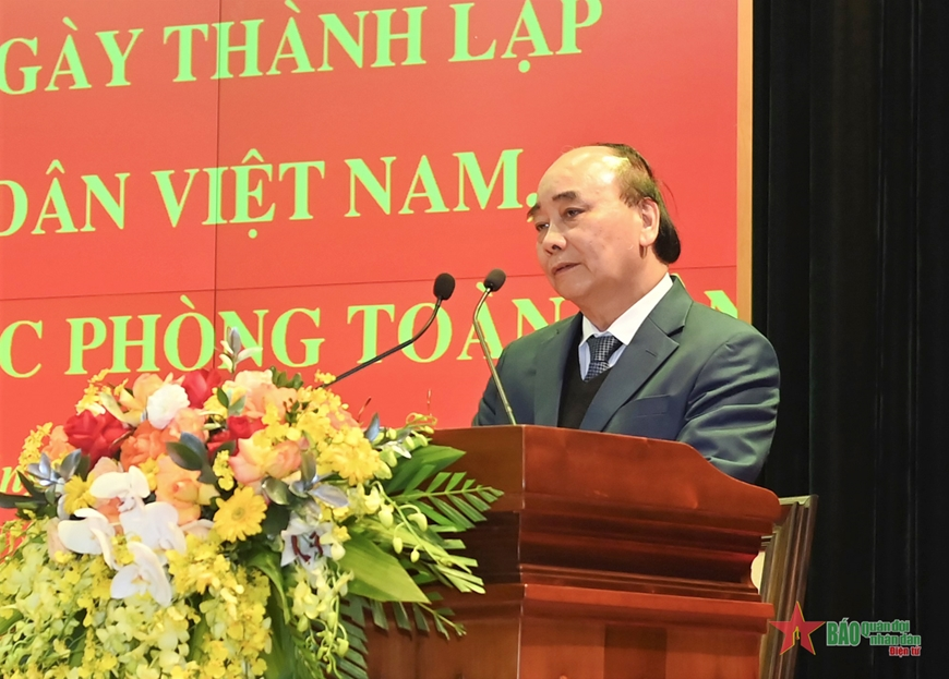 Chủ tịch nước Nguyễn Xuân Phúc, Thống lĩnh Lực lượng vũ trang (LLVT) nhân dân, Chủ tịch Hội đồng Quốc phòng và An ninh; Thủ tướng Chính phủ Phạm Minh Chính, Phó chủ tịch Hội đồng Quốc phòng và An ninh dự buổi gặp mặt.
