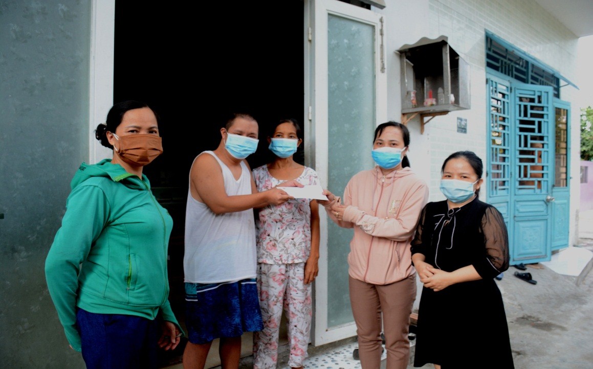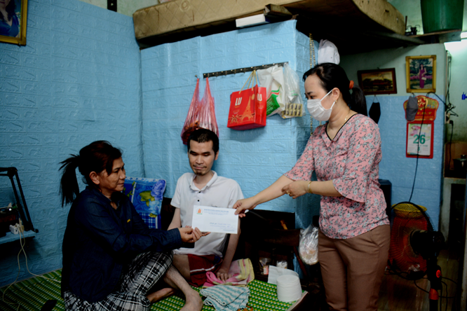 Bà Huỳnh Thị Kim Huệ, Chủ tịch Hội Nạn nhân chất độc da cam quận Liên Chiểu trao hỗ trợ cho anh Nguyễn Quốc Dũng