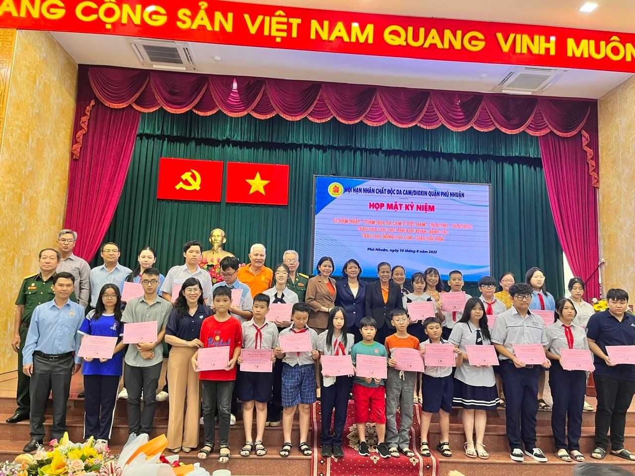 Tại buổi Họp mặt, Quận hội đã trao Kỷ niệm chương Vì nạn nhân chất độc da cam của Trung ương Hội cho 5 vị lãnh đạo quận, mạnh thường quân; Trao bảng vàng tri ân đến 7 cơ quan, đơn vị và cá nhân đã có nhiều đóng góp chăm lo cho hội viên; quận hội trao tặng 30 suất quà cho số hội viên có hoàn cảnh khó khăn; trong đó, Hội LHPN quận và Hội CTĐ quận đã trao trực tiếp 8 phần quà cho số hội viên thế hệ thứ 2, của Người hoạt động kháng chiến bị nhiễm chất độc hóa học và trong thời gian tới sẽ cử cán bộ hội cùng gia đình nhận chăm sóc một nạn nhân bị bệnh nặng không đi được; tại buổi Họp mặt cũng đã trao 31 suất học bổng cho con, cháu hội viên. Tổng số tiền chăm lo cho NNCĐDC trong dịp 10/8 là: 78.300.000 đồng (Thành hội chi số tiền 19 triệu đồng; Quỹ vì người nghèo của Quận 15 triệu đồng; Hội CTĐ quận và Hội LHPN quận ủng hộ 8 triệu đồng; gia đình ông Trịnh Tất Đạt ở 12/88-90 Đào Duy Anh, phường 9, quận Phú Nhuận ủng hộ 15 triệu đồng; 2 đơn vị tôn giáo ủng hộ 6 triệu đồng; Quỹ Quận hội chi 15.300.000 đồng). Đồng thời, phát động hưởng ứng tham gia Chương trình nhắn tin từ thiện “Chung tay xoa dịu nổi đau da cam năm 2023” do Trung ương Hội phát động từ ngày 20/7/2023 đến ngày 19/9/2023. Sau buổi Họp mặt, đại diện Ban Dân vận Quận ủy, MTTQ, Phòng LĐ-TB&XH, Hội CTĐ, Hội LHPN quận phối hợp với UBND, Ban chấp hành Chi (Tổ) hội các phường đến thăm hỏi và trao quà cho số hội viên đau ốm, bệnh tật không thể tham dự buổi Họp mặt