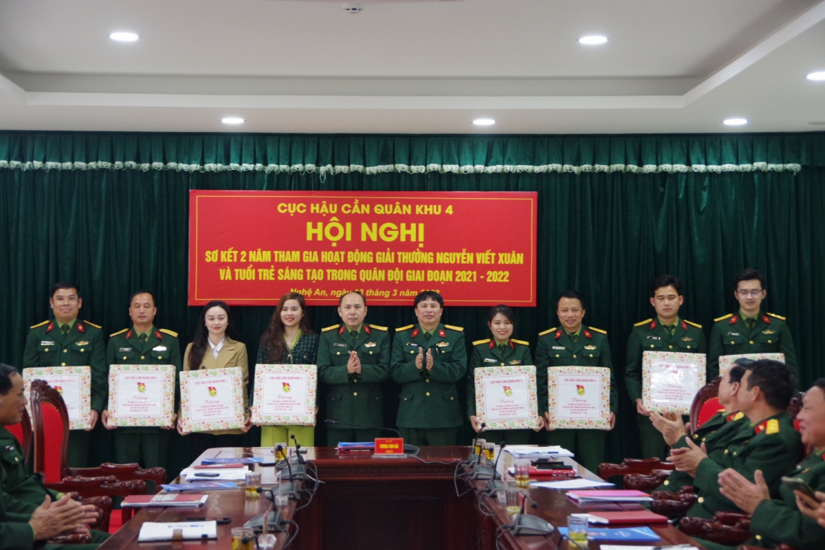 Dịp này Cục Hậu cần đã tôn vinh, biểu dương, tặng quà cho 8 cá nhân có nhiều thành tích xuất sắc trong việc tham gia Giải thưởng Nguyễn Viết Xuân và tham gia giải thưởng tuổi trẻ sáng tạo trong Quân đội.