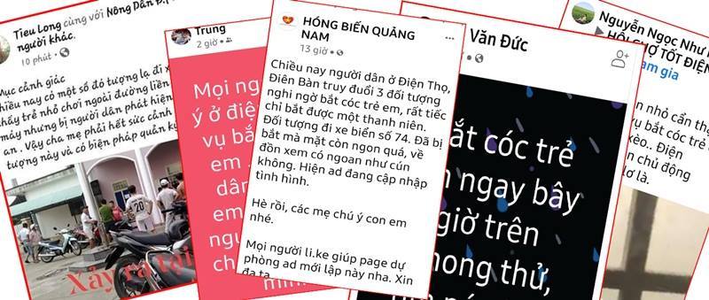 Tài khoản facebook khác thì chia sẻ: “Mọi người chú ý ở Điện Thọ có vụ bắt cóc trẻ em, vào nhà dân bắt trẻ em luôn…”. Có tài khoản lại đăng tải: “Anh chị em mình có con nhỏ thì cẩn thận nha. Đang có vụ bắt cóc trẻ em ở dưới xóm bánh xèo Điện Thọ. Hãy chủ động trước sẽ tốt hơn”.
