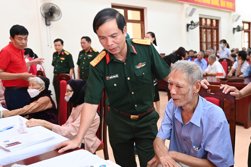 | Đại tá Nguyễn Quang Hiến, Phó Bí thư Thường trực Đảng ủy, Chính ủy Bộ CHQS tỉnh, ân cần thăm hỏi sức khỏe các đối tượng chính sách tại buổi khám bệnh, cấp phát thuốc miễn phí. |