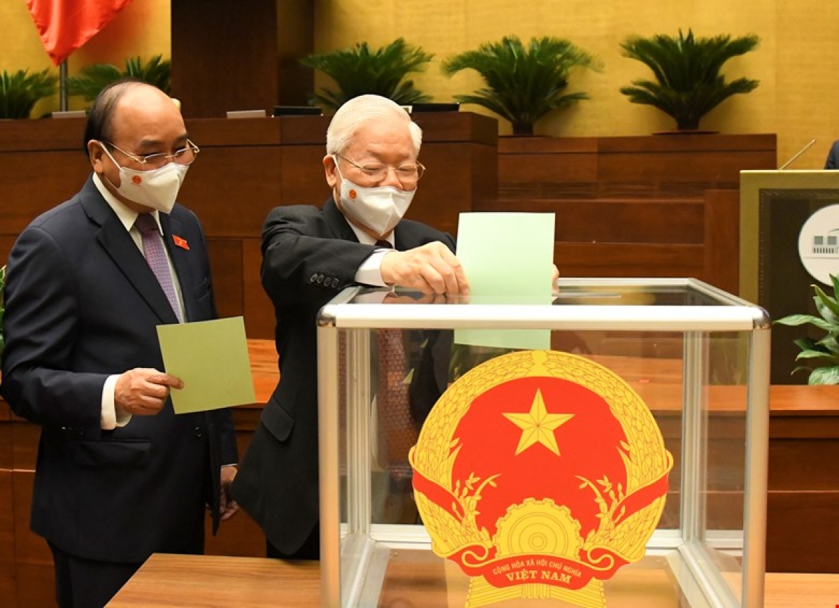 Tổng Bí thư Nguyễn Phú Trọng và Chủ tịch nước Nguyễn Xuân Phúc bỏ phiếu tại Kỳ họp thứ nhất, Quốc hội khoá XV