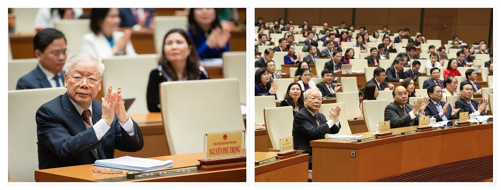 | Tổng Bí thư Nguyễn Phú Trọng, Chủ tịch nước Nguyễn Xuân Phúc, Thủ tướng Chính phủ Phạm Minh Chính cùng các đại biểu Quốc hội dự phiên bế mạc kỳ họp. Ảnh: Tuấn Huy |