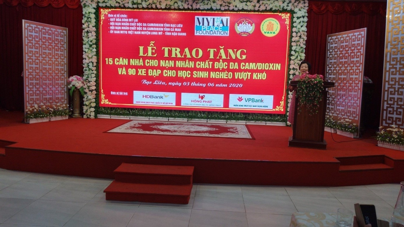 Chiều ngày 03/6/2020, trong chuỗi các hoạt động Chương trình Từ thiện năm 2020, bà Trương Ngọc Thủy, Chủ tịch Hội đồng quản lý Quỹ Hòa Bình Mỹ Lai và các thành viên đoàn công tác của Quỹ, các nhà tài trợ: Ngân hàng Thương mại cổ phần Thành phố Hồ Chí Minh (HD Bank), Ngân hàng Thương mại cổ phần Việt Nam Thịnh Vượng (VP Bank) và Công ty Cổ phần địa ốc Hồng Phát đến thăm và tặng nhà Tình nghĩa cho NNCĐDC và tặng xe đạp cho các em học sinh nghèo vượt khó ở 3 tỉnh Cà Mau, Bạc Liêu và Hậu Giang.