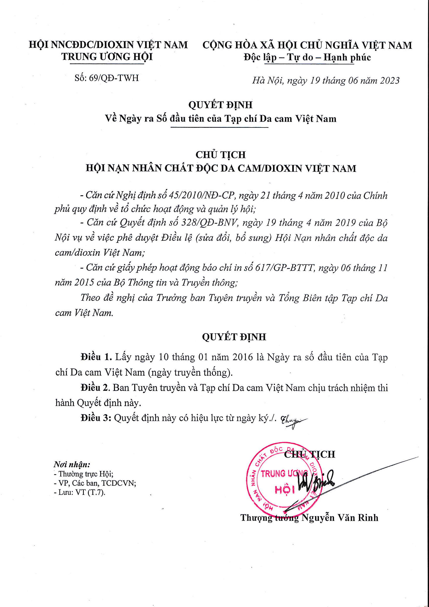 Quyết định về việc lấy ngày 10/1 hàng năm là ngày Truyền thống của Tạp chí Da cam Việt Nam