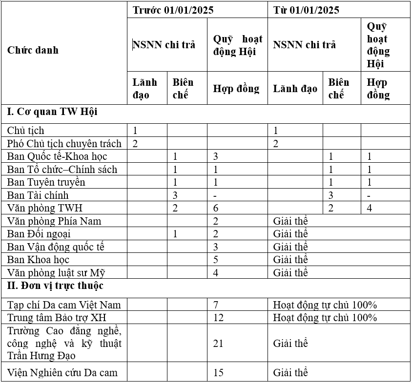 Thực hiện tinh giản tổ chức bộ máy, theo chỉ đạo của trên, tại cơ quan Trung ương Hội đã kiên quyết, tích cực sắp xếp bộ máy: giải thể 5 cơ quan (Văn phòng phía Nam, Ban Khoa học, Ban Đối ngoại, Ban Vận động quốc tế và Văn phòng Liên lạc Luật sư Mỹ) chuyển nhiệm vụ sang cơ quan khác đảm nhiệm và 2 tổ chức (Trường Cao đẳng nghề, công nghệ và kỹ thuật Trần Hưng Đạo và Viện Nghiên cứu Da cam); chuyển 2 tổ chức (Tạp chí Da cam Việt Nam và Trung tâm Bảo trợ Xã hội) sang hoạt động tự chủ 100% kinh phí và nhân lực. Tổng quân số giải thể 48 người và chuyển tự chủ 22 người. Lập Ban Quốc tế-Khoa học có Trưởng ban và 1 công chức. Hiện cơ quan Trung ương Hội: 19 người (1 không chuyên trách); 2 tổ chức tự chủ: 19 người. Cụ thể theo bảng sau: