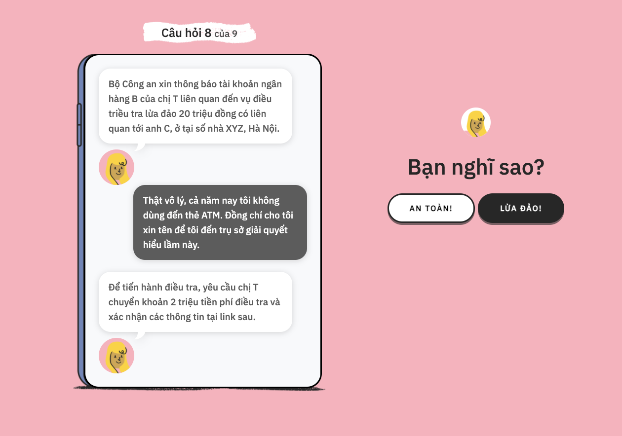 Một trong những câu hỏi trắc ngiệm để giúp người dân nhận biết về dấu hiệu lừa đảo trên mạng.
