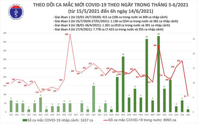 Như vậy, tính đến 6h ngày 14/6, Việt Nam có tổng cộng 8.993 ca ghi nhận trong nước và 1.637 ca nhập cảnh. Số lượng ca mắc mới tính từ ngày 27/4 đến nay: 7.423 ca.