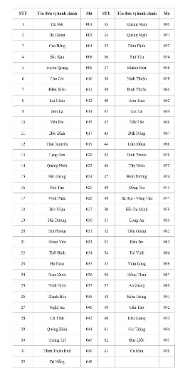 Dưới đây là bảng Danh mục mã tỉnh, thành phố nơi công dân đăng ký khai sinh được ban hành kèm theo Thông tư 07/2016/TT-BCA: