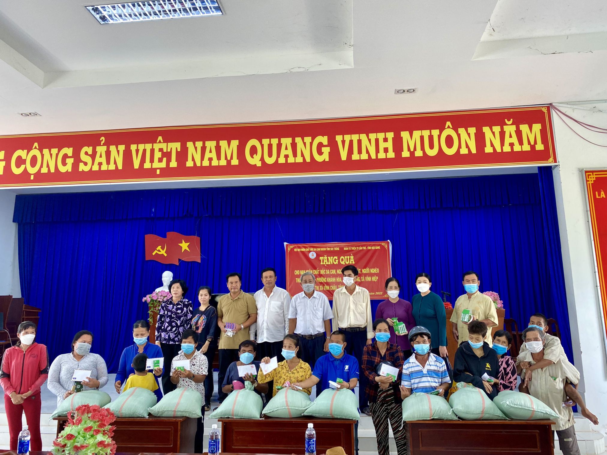 Ông Nguyễn Hùng, Phó Chủ tịch thường trực Tỉnh Hội (hàng thứ 2, thứ 5 từ trái sang) trao quà cho các nạn nhân
