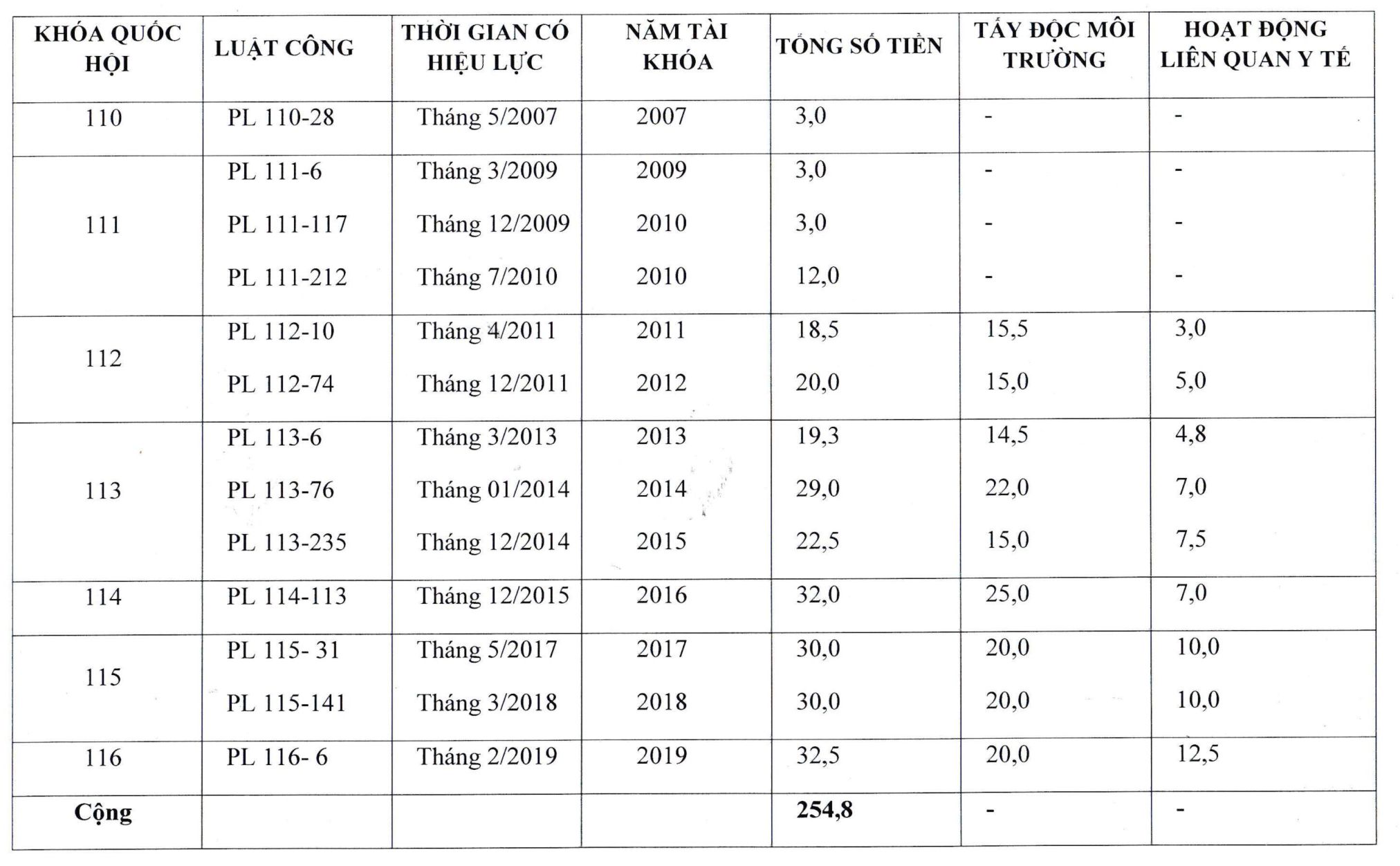 Dưới đây là bảng thống kê ngân sách Quốc hội Mỹ phê duyệt hằng năm để Chính phủ Mỹ tham gia khắc phục hậu quả CĐDC ở Việt Nam (đơn vị tính: triệu đô la Mỹ)