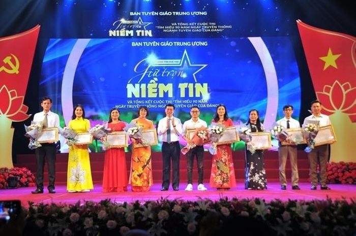 | Thầy giáo Lữ Đức Báu (ngoài cùng bên phải) nhận giải trong cuộc thi “Tìm hiểu 90 năm ngày truyền thống ngành Tuyên giáo của Đảng” do Báo điện tử Đảng Cộng sản Việt Nam tổ chức. |