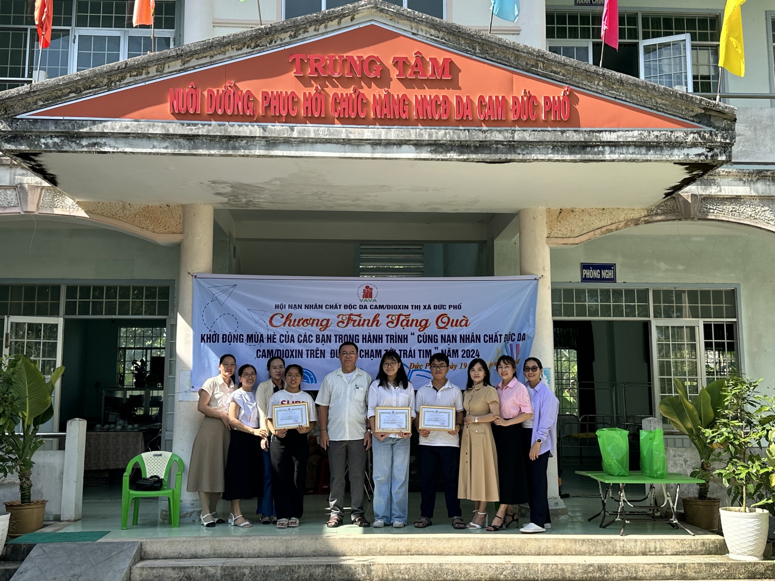 Ghi nhận những tấm lòng vàng, ông Nguyễn Văn Toàn, Chủ tịch Hội NNCĐDC/dioxin thị xã Đức Phổ đã trao tặng Bằng ghi nhận Tấm lòng vàng cho em Lê Đỗ Diễm Hằng, Lê Đỗ Chí Hùng, học sinh Trường THCS Chánh Lộ, thành phố Quảng Ngãi và em Phạm Nguyễn Thúy Hằng, học sinh Trường THCS COLETTE, quận 3, Thành phố Hồ Chí Minh. Ông Nguyễn Văn Toàn cảm ơn gia đình các cháu và các mạnh thường quân đã quan tâm, chia sẻ, hỗ trợ giúp đỡ NNCĐDC, ông mong muốn các mạnh thường quân tiếp tục đồng hành cùng với Hội NNCĐDC/dioxin thị xã và Trung tâm trong thời gian đến.