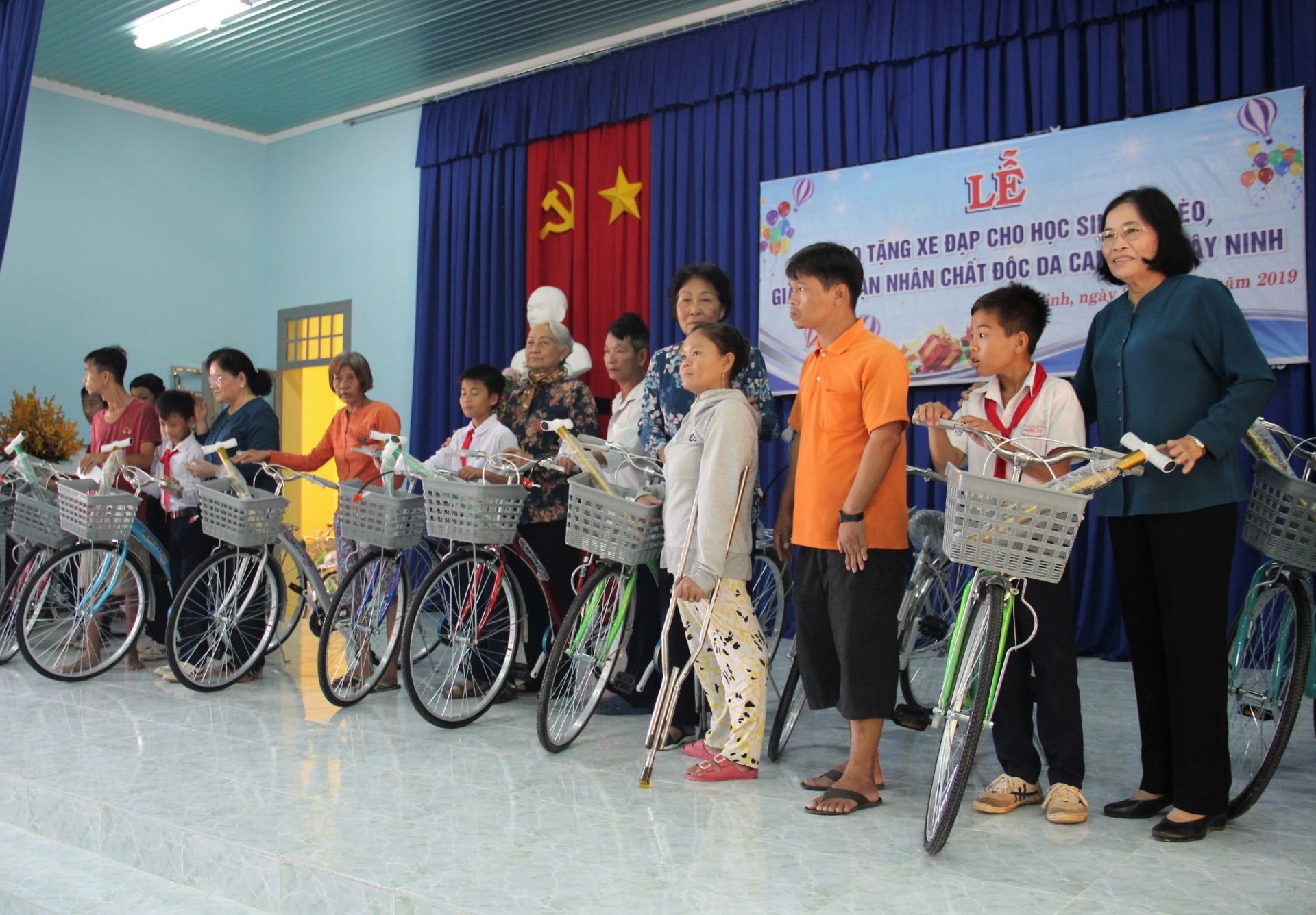 Vừa qua, Hội Nạn nhân chất độc da cam (NNCĐDC)/dioxin tỉnh Tây Ninh phối hợp với Hội Bảo trợ người nghèo tỉnh Tây Ninh, trao tặng 100 chiếc xe đạp trị giá 160 triệu đồng cho 50 gia đình NNCĐDC có hoàn cảnh khó khăn và 50 em học sinh nghèo tại các xã trên địa bàn 3 huyện: Dương Minh Châu, Châu Thành và huyện Gò Dầu. Dự buổi trao quà có các đồng chí nguyên là lãnh đạo của tỉnh Tây Ninh và tỉnh Đồng Nai. Đây là số quà do Bà Lâm Thị Nguyệt, nguyên Tỉnh ủy viên tỉnh Đồng Nai, nguyên Bí thư huyện ủy huyện Nhơn Trạch tỉnh Đồng Nai tài trợ.