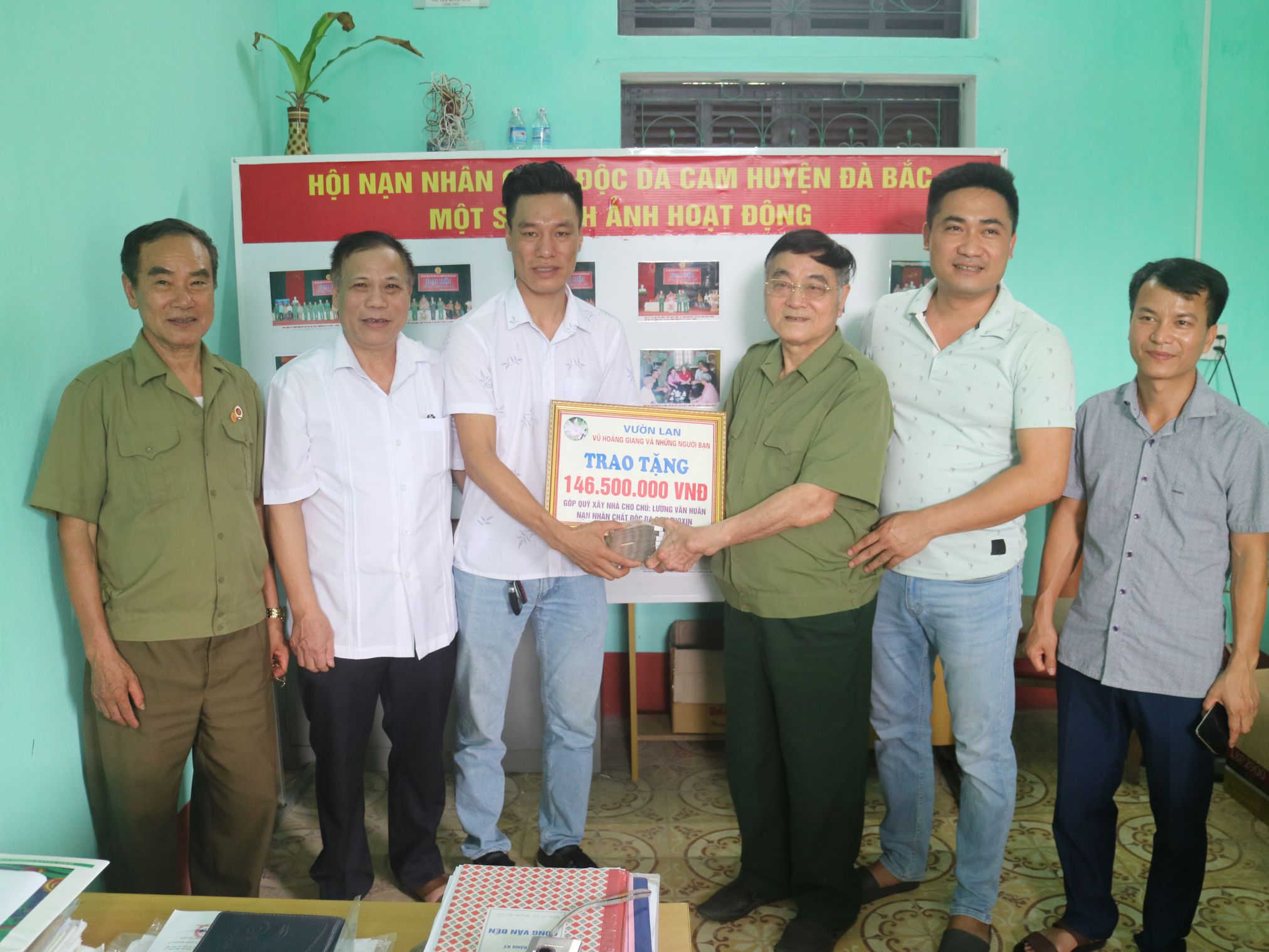 Chiều 04/5/2021, tại Văn phòng Hội NNCĐDC/dioxin huyện Đà Bắc (Hòa Bình), Thạc sĩ, nhà giáo Vũ Hoàng Giang, Phó hiệu trưởng Trường THCS xã Nánh Nghê, huyện Đà Bắc đã trao 146.500.000 đồng cho Thường trực Hội NNCĐDC/dioxin huyện Đà Bắc. Đây là số tiền của thầy giáo Vũ Hoàng Giang và những người bạn ủng hộ gia đình NNCĐDC Lường Văn Huân (SN 1954), xóm Hạ, xã Đồng Ruộng, huyện Đà Bắc để xây nhà ở.