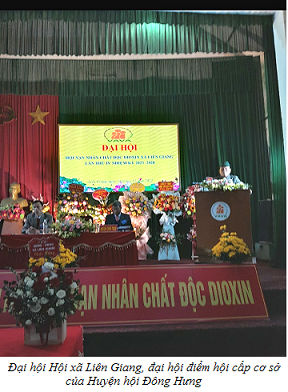 Đại hội các cấp hội ở Thái Bình được tiến hành theo trình tự: Đại hội cấp cơ sở vào quý I và quý II năm 2023. Mỗi huyện, thành hội tổ chức một đại hội điểm cấp hội cơ sở, có mời chủ tịch các hội cơ sở khác trong huyện, thành phố về dự dể rút kinh nghiệm. Đại hội các hội cấp huyện, thành phố phải hoàn thành trong quý III năm 2023 và đại hội hội cấp tỉnh hoàn thành trong tháng 11 năm 2023, để tiến tới Đại hội đại biểu toàn quốc Hội Nạn nhân chất độc da cam/dioxin Việt Nam. Đến nay nhiều huyện, thành hội đã hoàn thành tổ chức đại hội điểm. Nói chung tuy có khó khăn vì tình hình hội vừa qua có nhiều biến động về mặt tổ chức và nhân sự do việc rà soát thực chứng người hoạt động kháng chiến và con đẻ của họ bị nhiễm chất độc hóa học nhưng được sự quan tâm lãnh đạo, chỉ đạo của Tỉnh ủy, UBND tỉnh và cấp ủy, chính quyền các cấp việc tiến hành tổ chức đại hội hiện nay ở Thái Bình đã tiến triển thuận lợi và tốt đẹp.
