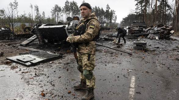 Một binh sĩ Ukraine canh gác trên đường dẫn tới Bucha