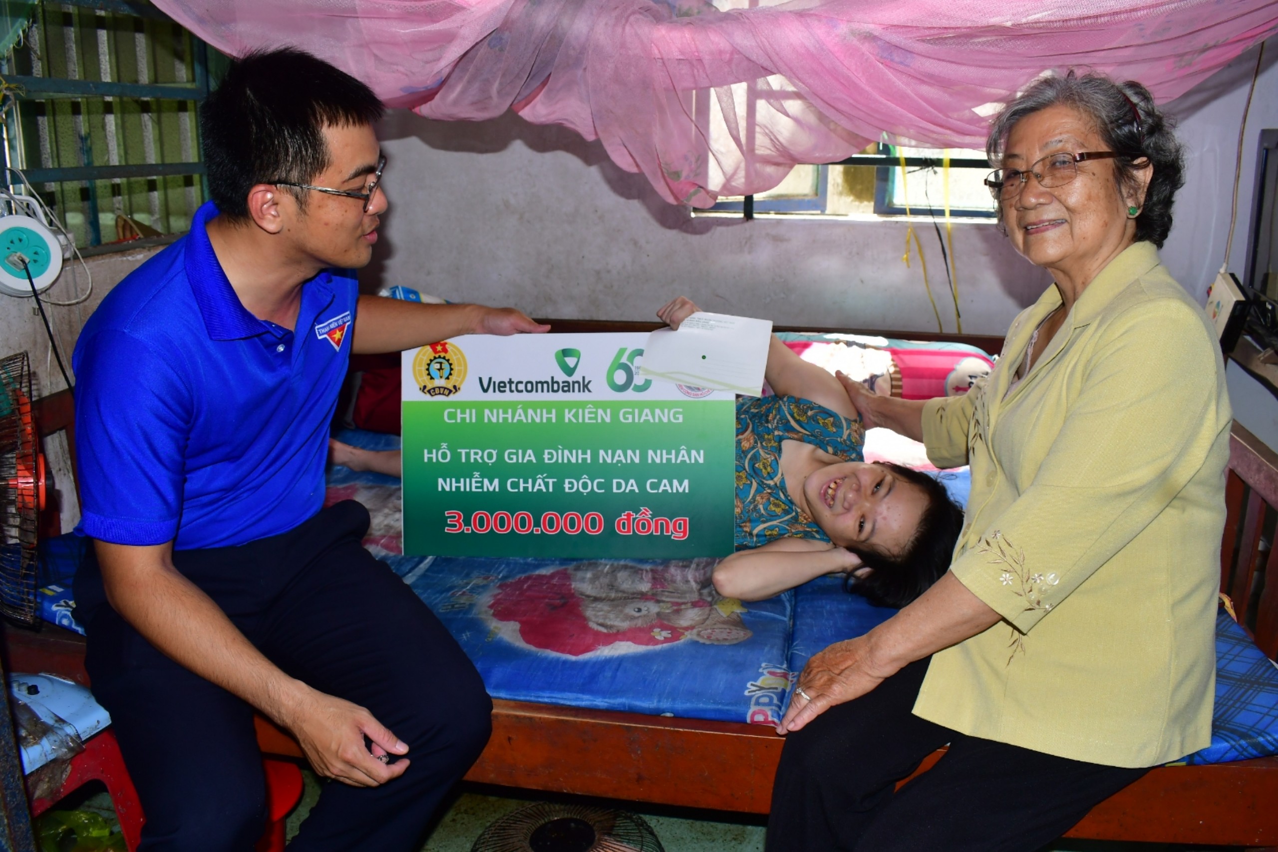 Viecombank Kiên Giang tặng 5 suất quà (trị giá 3 triệu đồng/suất) cho 5 NNCĐDC; tặng quà và trao tiền hỗ trợ 1 triệu đồng/tháng cho Bà mẹ Việt Nam anh hùng Võ Thị Tám - một trong ba Bà mẹ Việt Nam anh hùng được Viecombank Kiên Giang nhận phụng dưỡng suốt đời.