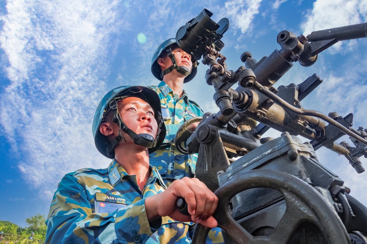 Trắc thủ pháo phòng không Đại đội 4, Trung đoàn 591, Sư đoàn 377 thực hành ngắm, quan sát mục tiêu trên không