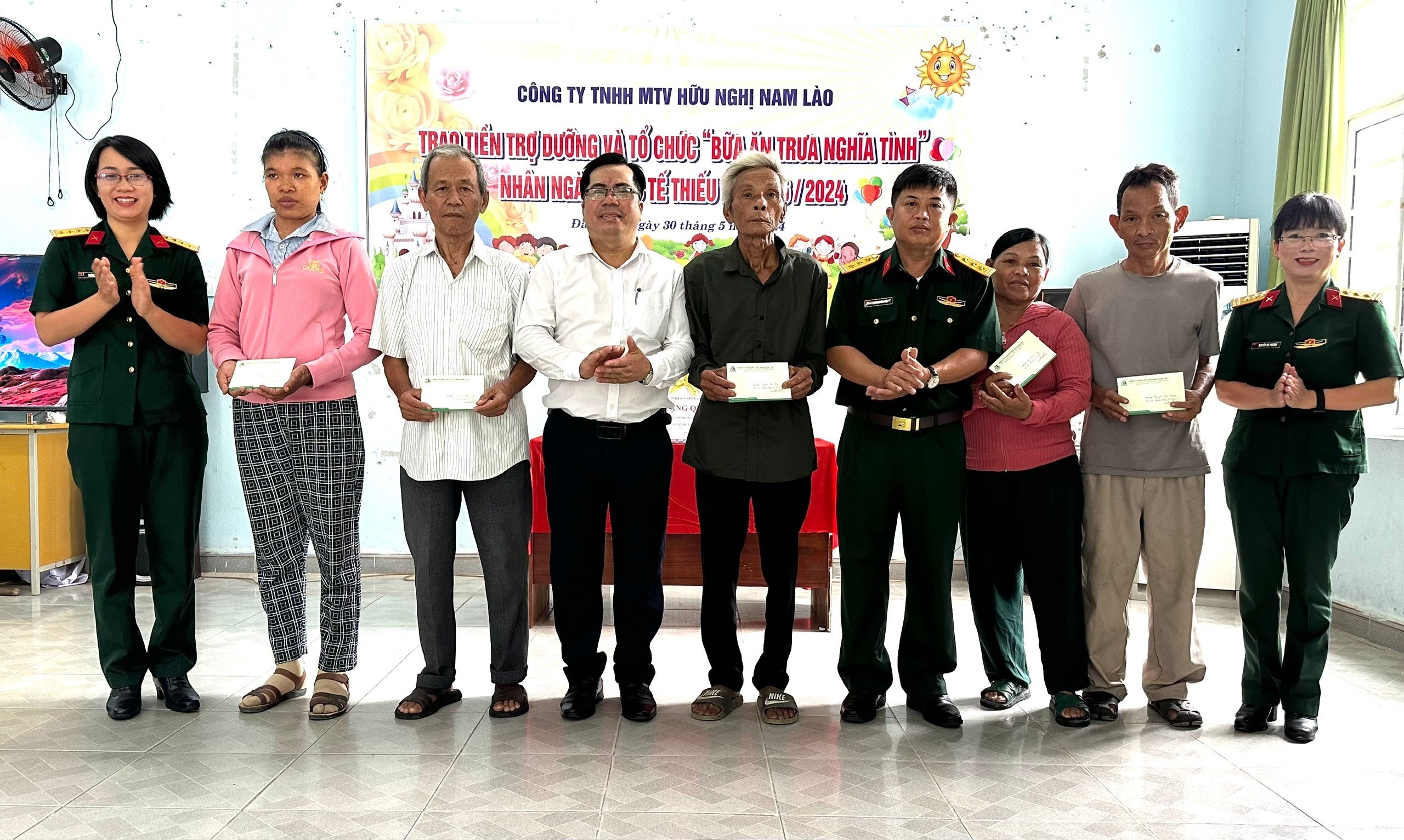 Công ty TNHH MTV Hữu nghị Nam Lào đã đến thăm và trao tiền trợ dưỡng thường xuyên quý 2/2024 cho 9 gia đình NNCĐDC có hoàn cảnh khó khăn, mỗi suất trợ dưỡng là 900.000đ/quý, tổng số tiền là 8.100.000 đồng; tổ chức “Bữa ăn trưa nghĩa tình” và tặng quà cho NNCĐDC đang sinh hoạt, học tập tại Trung tâm Bảo trợ NNCĐDC và Trẻ em bất hạnh TP Đà Nẵng.