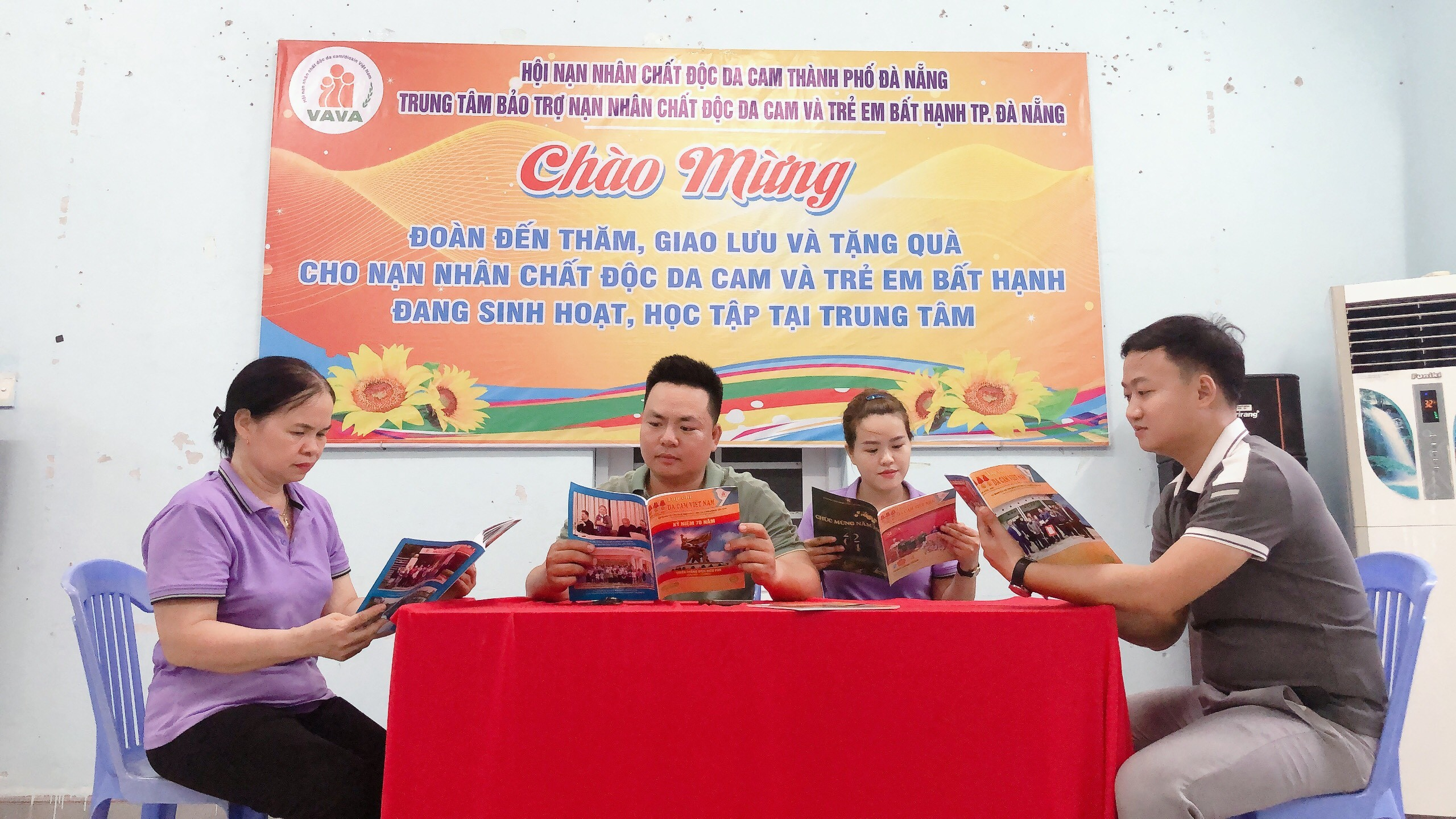 Hình ảnh cán bộ, nhân viên Trung tâm thuộc Thành hội Đà Nẵng đọc Tạp chí Da cam Việt Nam (3 ảnh trên).