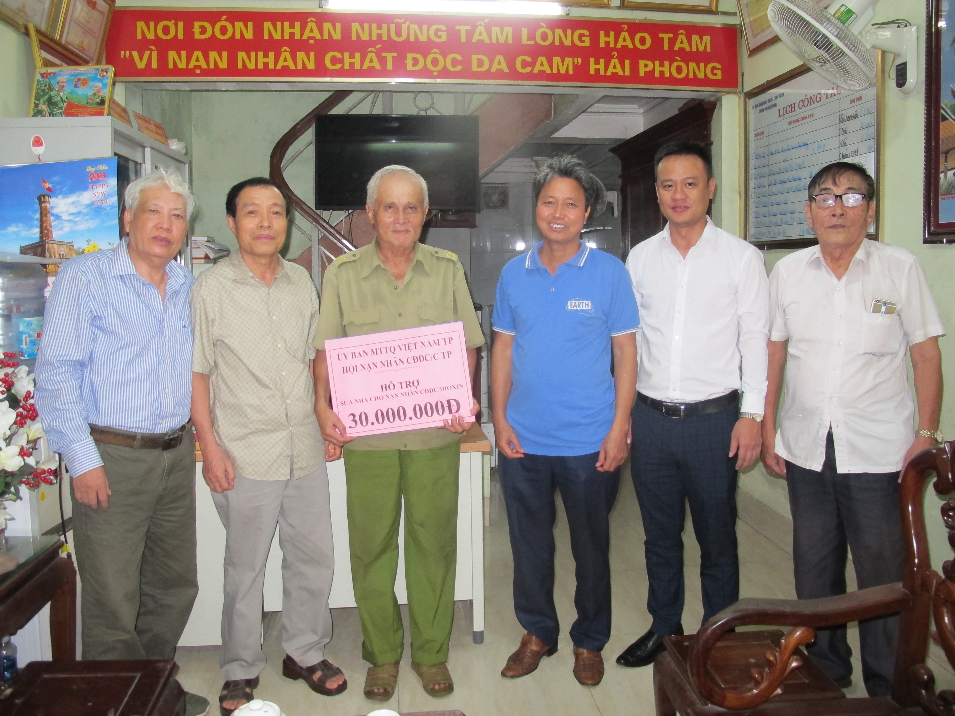 Sáng 21/9/2023, tại Trụ sở Hội NNCĐDC/dioxin thành phố Hải Phòng, các đồng chí Lê văn Hoan, Đặng Xuân Viễn, Phó Chủ tịch Hội NNCĐDC/dioxin thành phố, cán bộ Hội NNCĐDC/dioxin quận Hồng Bàng và một số cán bộ của UBND phường Minh Khai đã trao 30 triệu đồng để sửa chữa nhà ở cho gia đình nạn nhân chất độc da cam Nguyễn Đăng Nghìn, sinh năm 1949, thường trú tại 2/23 phố Tam Bạc, phường Minh Khai, quận Hồng Bàng./.