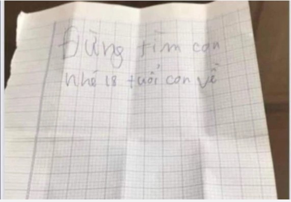 Đáng chú ý, trước khi bỏ nhà đi, bé trai có để lại bức thư với dòng chữ viết tay nguệch ngoạc: "Đừng tìm con nhé. 18 tuổi con về".