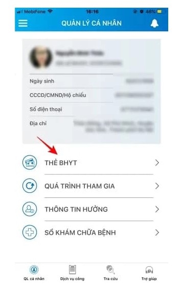 Bước 2: Tại giao diện quản lý cá nhân: Chọn Thẻ BHYT