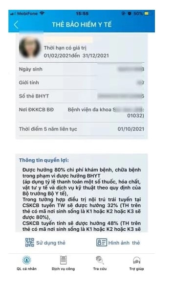 Hệ thống sẽ cung cấp về thẻ BHYT, bao gồm: Thời hạn của thẻ BHYT, nơi khám chữa bệnh, thời điểm đủ 5 năm liên tục, quyền lợi về BHYT…