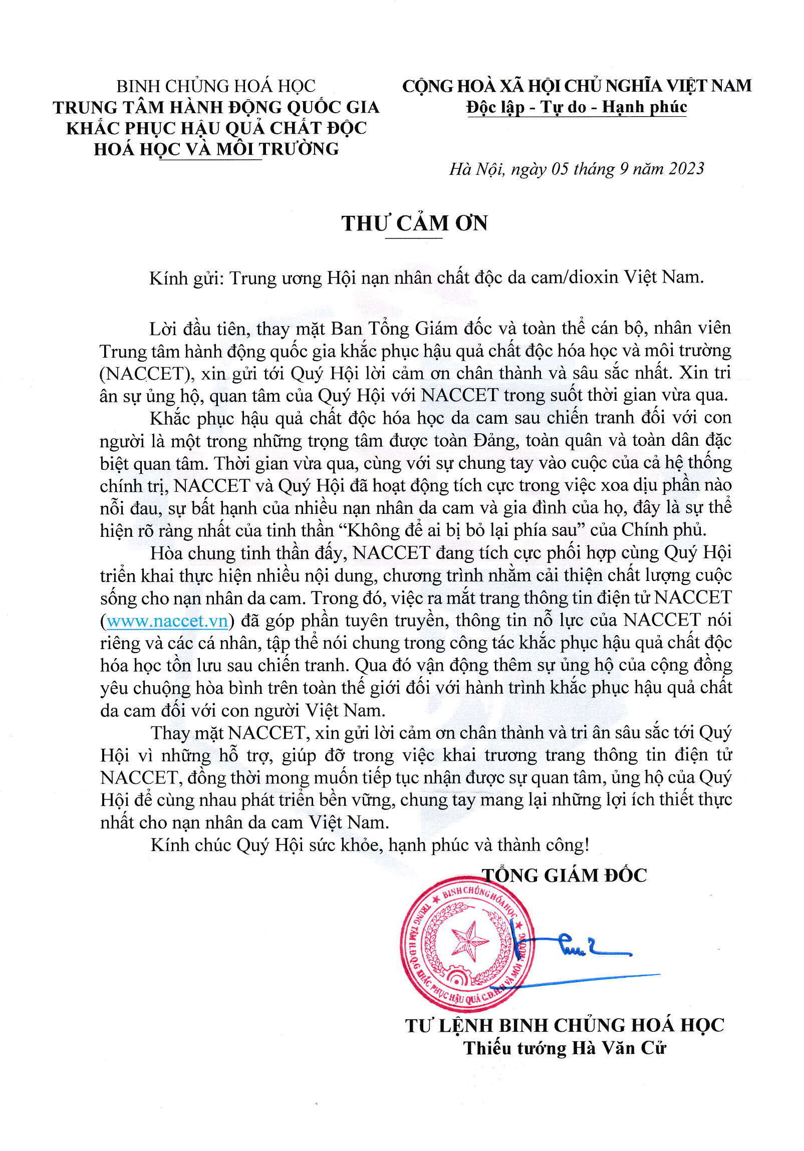 Thư cảm ơn TWH Nạn nhân chất độc da cam/dioxin Việt Nam của Tổng Giám đốc Trung tâm Hành động Quốc gia khắc phục hậu quả chất độc hóa học và môi trường