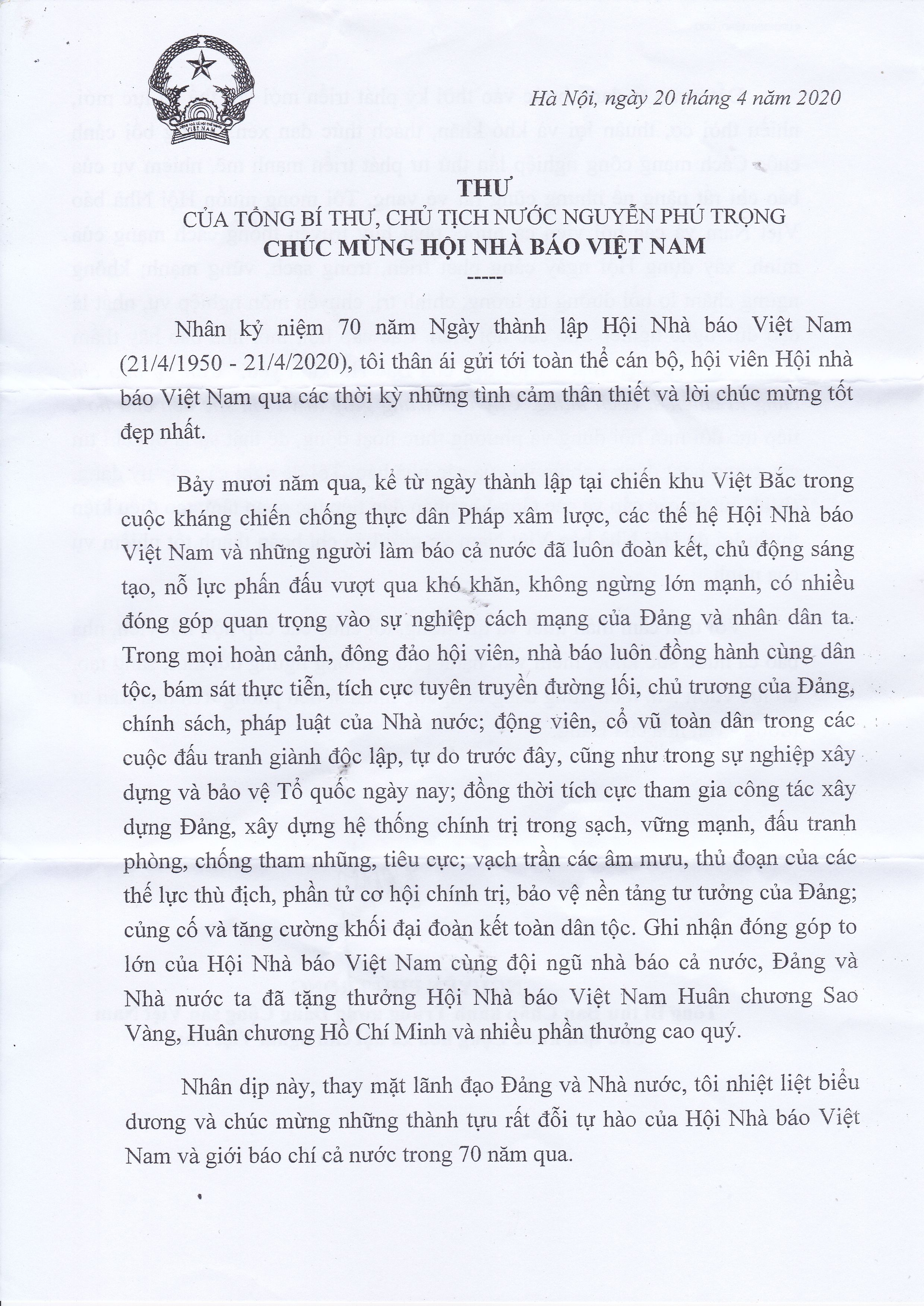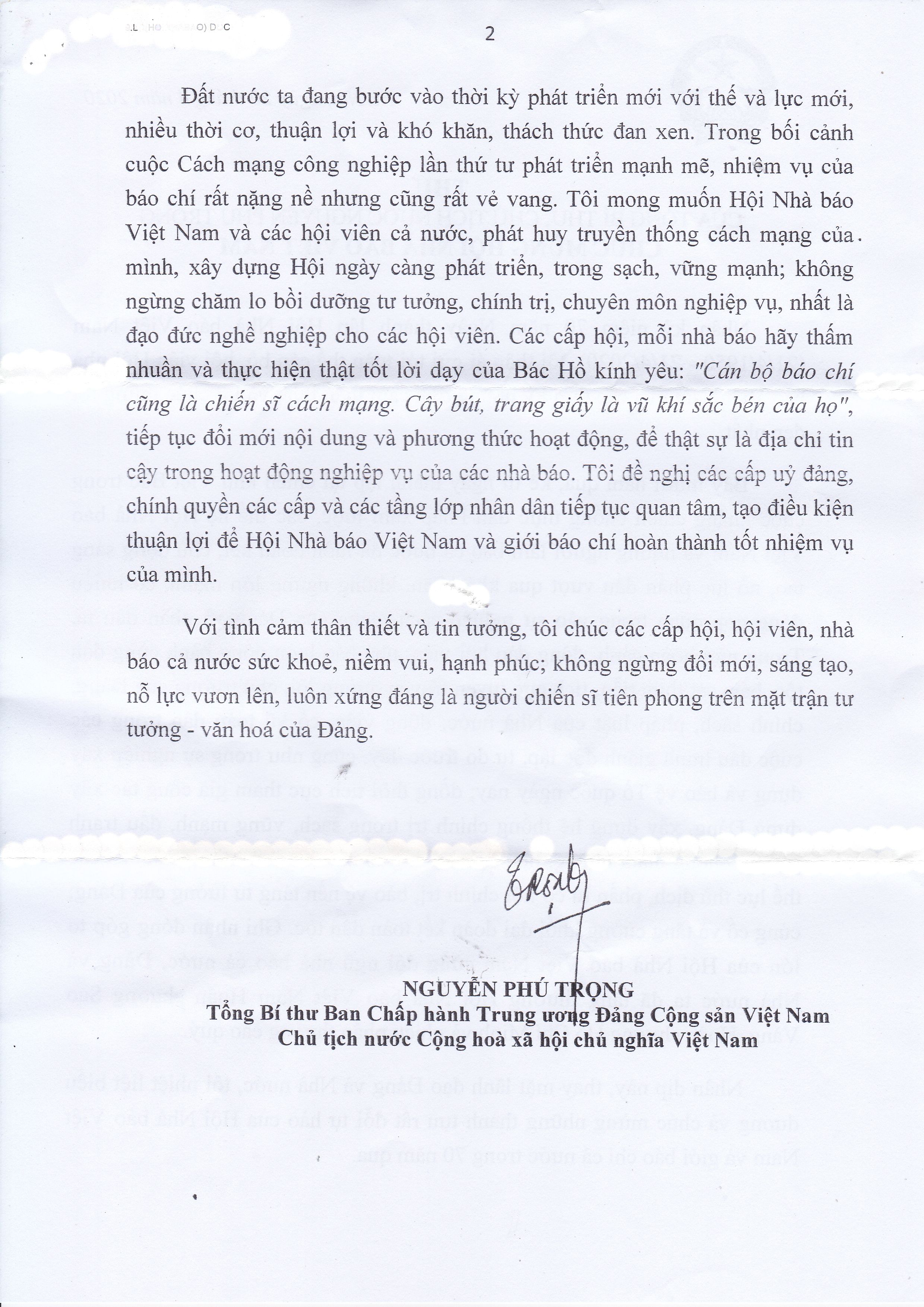 THƯ CỦA TỔNG BÍ THƯ, CHỦ TỊCH NƯỚC NGUYỄN PHÚ TRỌNG CHÚC MỪNG HỘI NHÀ BÁO VIỆT NAM
