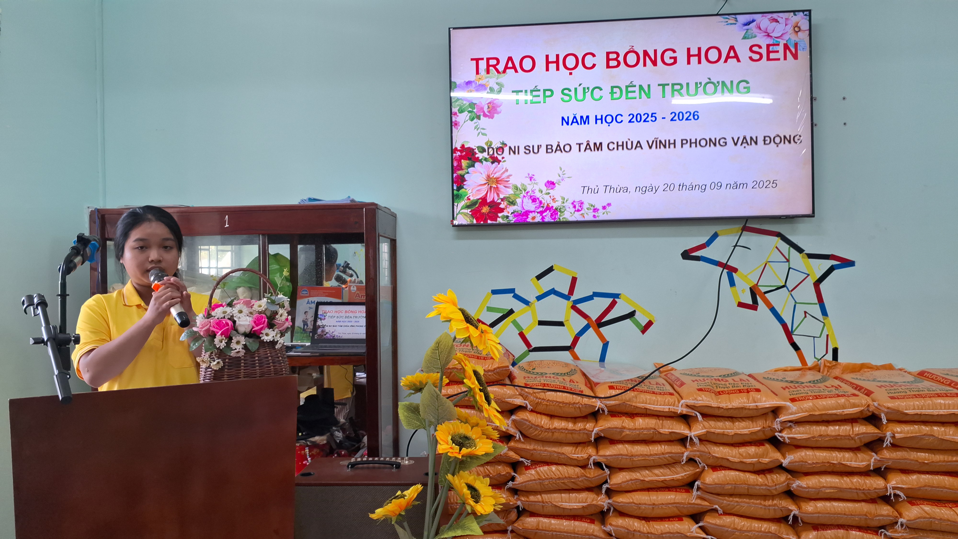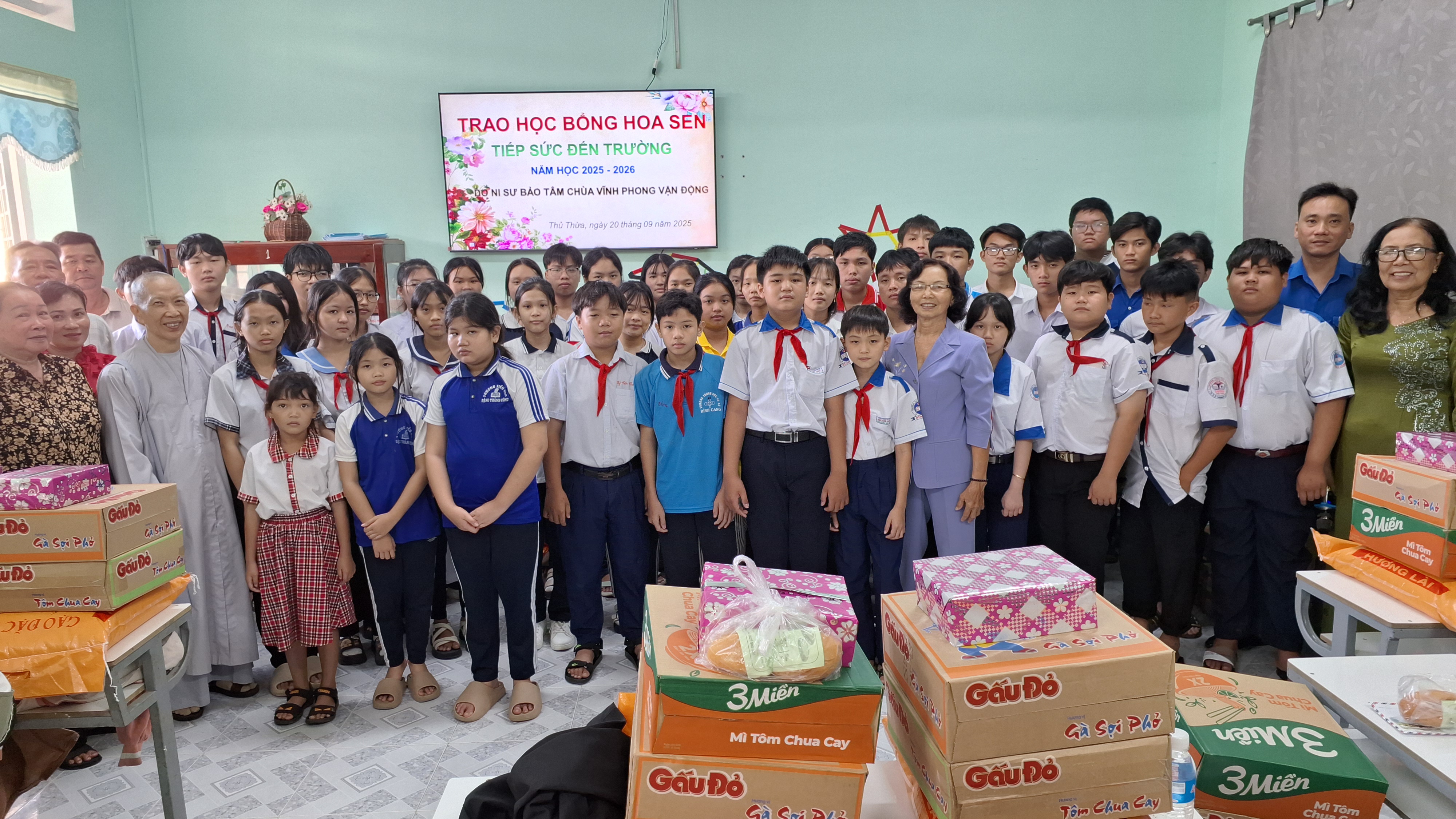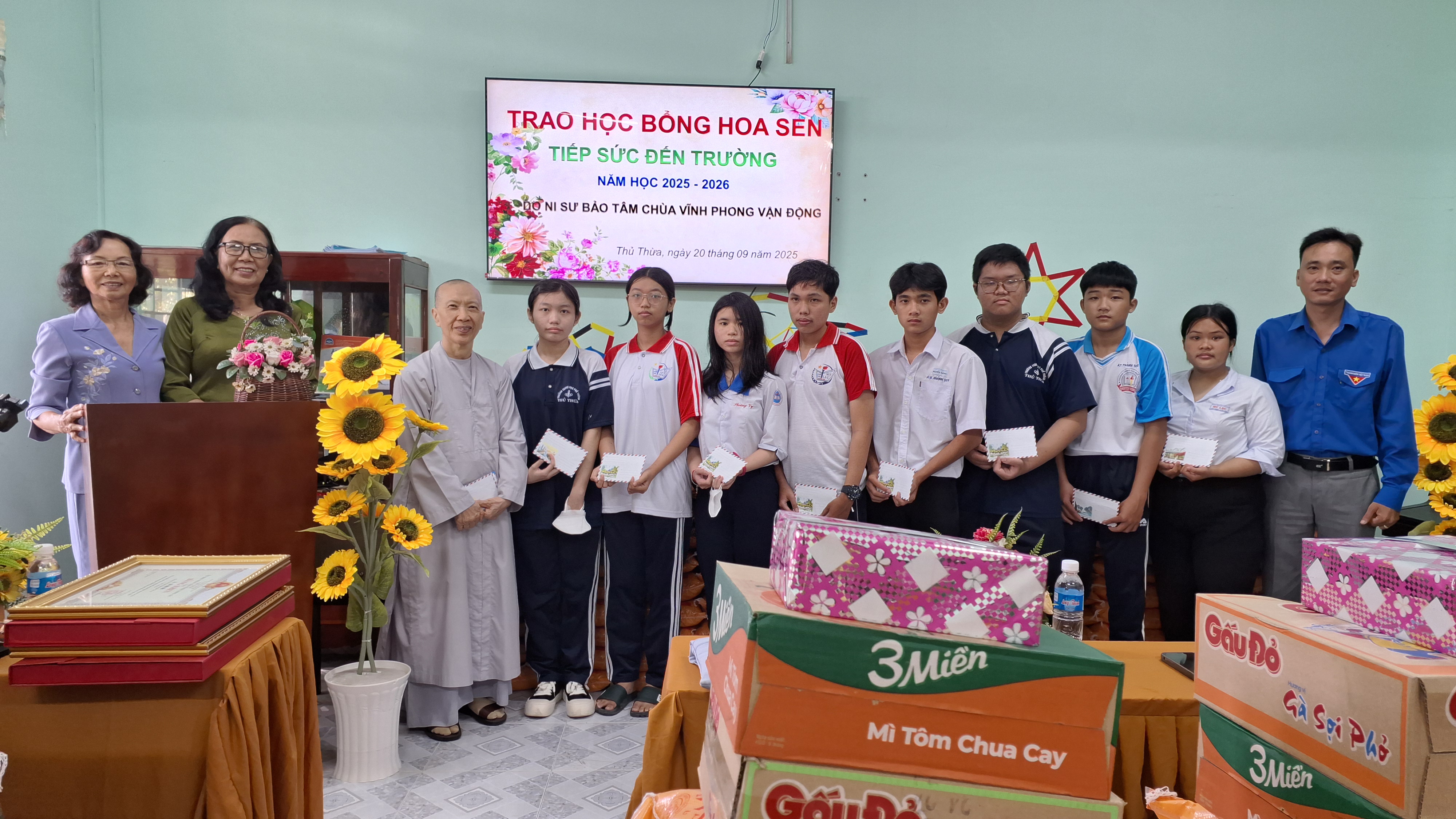 Sáng 20/09/2025, Ni sư Thích Nữ Bảo Tâm ( Chùa Vĩnh Phong) cùng bà Trần Thị Láng, nguyên Phó Chủ tịch Hội NNCĐDC/dioxin (huyện Thủ Thừa cũ) và bà Huỳnh Thị Thu Loan, nguyên Chủ tịch Hội Khuyến học (huyện Thủ Thừa cũ), tỉnh Long An, Hiệu trưởng trường Bồ Đề Phương Duy (nay là xã Thủ Thừa, tỉnh Tây Ninh), tổ chức trao tặng học bổng Hoa Sen cho học sinh, sinh viên mồ côi, con cháu của NNCĐDC, học sinh có hoàn cảnh đặc biệt khó khăn trên địa bàn.