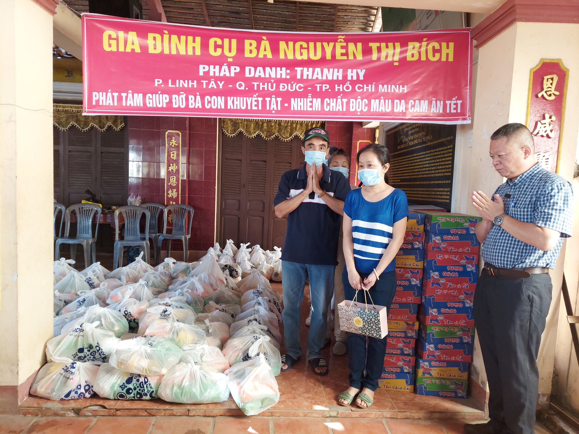 Sáng 16/01/2021, tại Đình Vĩnh Phong, Thị trấn Thủ Thừa, Hội NNCĐDC/dioxin huyện Thủ Thừa (Long An) và Ni sư Bảo Tâm, chùa Vĩnh Phong, đã tổ chức tặng 150 phần quà cho NNCĐDC người khuyết tật, hộ nghèo. Mỗi phần quà gồm: gạo, mì gói, nhu yếu phẩm và tiền mặt trị giá 150.000 đồng/phần. Tổng số quà được trao tặng lần này trị giá trên 22 triệu đồng, đây là quà của gia đình cụ bà Nguyễn Thị Bích (Pháp danh Thanh Hy) ở phường Linh Tây, quận Thủ Đức, TP HCM tài trợ.