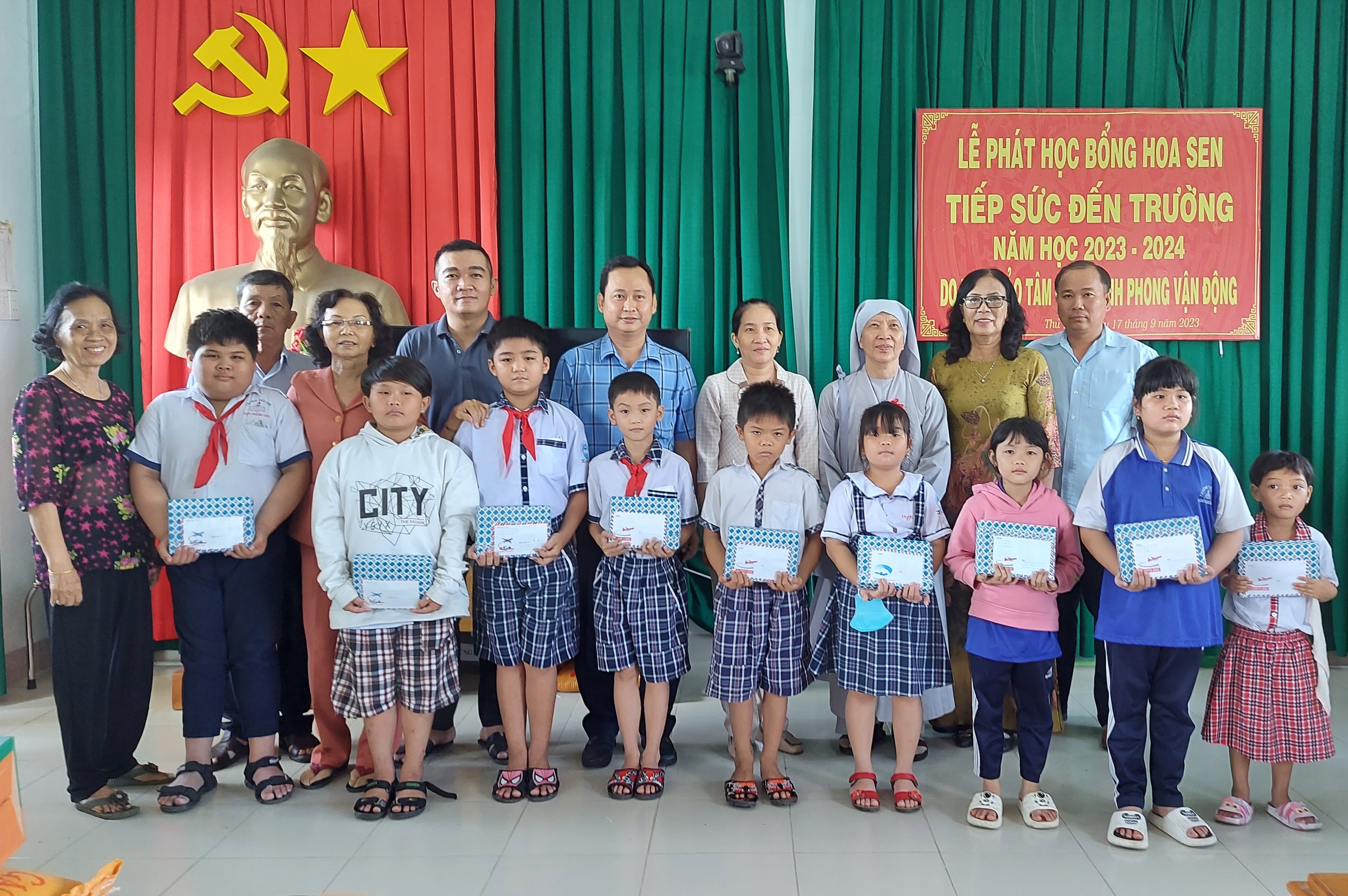 Tông số 106 em học sinh, sinh viên (trong đó có 10 học sinh Tiểu học, 33 học sinh trung học cơ sở, 24 học sinh trung học phổ thông và 39 sinh viên cao đẳng, đại học) được nhận học bổng Hoa Sen năm học 2023-2024 bằng tiền mặt: học sinh tiểu học 1,2 triệu đồng/em; học sinh trung học phổ thông cơ sở nhận 1,5 triệu đồng/em; học sinh trung học phổ thông nhận 02 triệu đồng/em và sinh viên cao đẳng, đại học được nhận 03 triệu đồng/em. Ngoài số tiền mặt, các em còn được nhân quà, gồm: 10 kg gạo, 01 thùng mì và 10 quyển tập/01 em. Tổng số quà và tiền mặt học bổng Hoa Sen trao tặng lần này trị giá 265.720.000 đồng do Ni sư Thích nữ Bảo Tâm vận động các mạnh thường quân tài trợ.