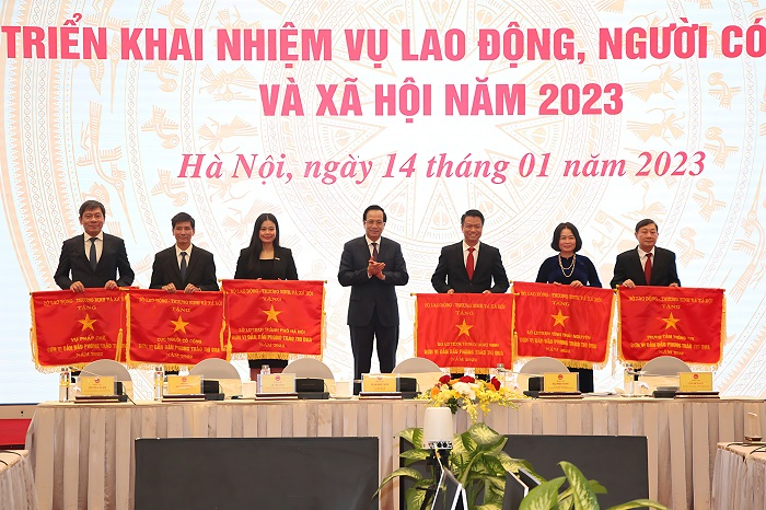 Bộ trưởng Bộ Lao động- Thương binh và Xã hội trao trao cờ và tặng thưởng đại diện 6/21 đơn vị dẫn đầu phong trào thi đua của ngành. Ảnh: MẠNH DŨNG