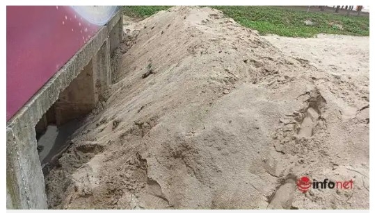 | Miệng cống đã đóng, phía trước là cát lấp đầy, không xả thải ra bãi biển |