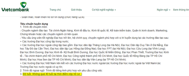 Vậy nhưng, thông báo tuyển dụng nhân sự đợt VI/2022 trên webiste của Vietcombank mới đây đã nâng mức tuổi ứng viên có thể ứng tuyển lên 40 tuổi.
