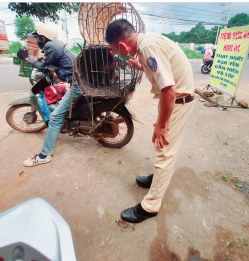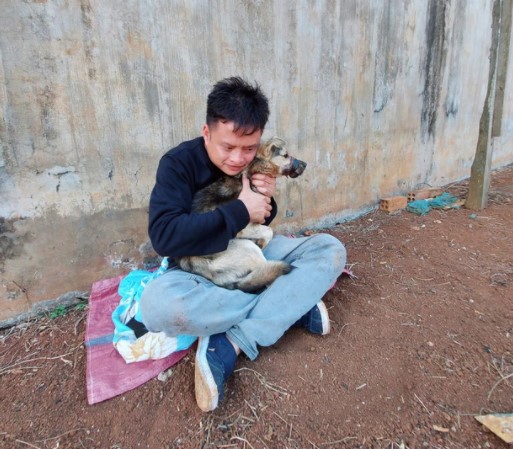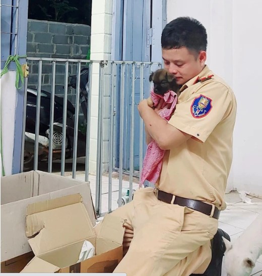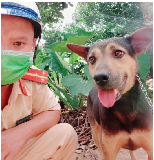 Thượng úy Dương cứu hộ một chú chó bị buộc mõm đang trên đường đưa vào lò mổ