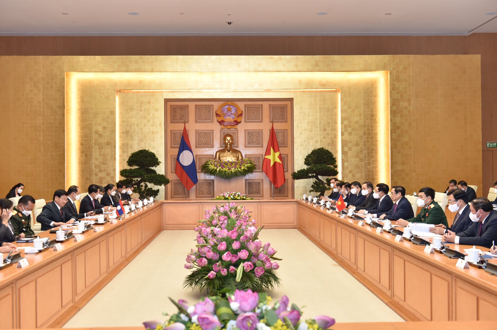Thủ tướng Phạm Minh Chính và Tổng Bí thư, Chủ tịch nước Thoong-lun Xi-xu-lít bày tỏ vui mừng quan hệ hữu nghị vĩ đại, đoàn kết đặc biệt và hữu nghị truyền thống Việt Nam - Lào không ngừng được củng cố, ngày càng đi vào chiều sâu và hiệu quả. Dù bị ảnh hưởng bởi dịch COVID-19, hai bên đã nỗ lực duy trì trao đổi đoàn và tiếp xúc cấp cao, phát huy hiệu quả các cơ chế hợp tác song phương ở các cấp; hợp tác trong các lĩnh vực an ninh, quốc phòng, kinh tế, kết nối giao thông, giáo dục đào tạo, hợp tác giữa các địa phương tiếp tục phát triển; kim ngạch thương mại hai chiều 5 tháng đầu năm 2021 đạt 570,7 triệu USD, tăng gần 40% so với cùng kỳ năm 2020; hiện Việt Nam có 208 dự án đầu tư tại Lào còn hiệu lực với tổng vốn đăng ký 5,16 tỷ đô-la Mỹ.
