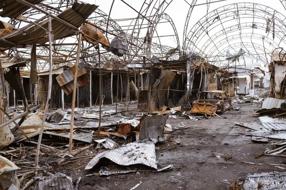 Một khu chợ bị cháy ở thành phố Chernihiv, Ukraine
