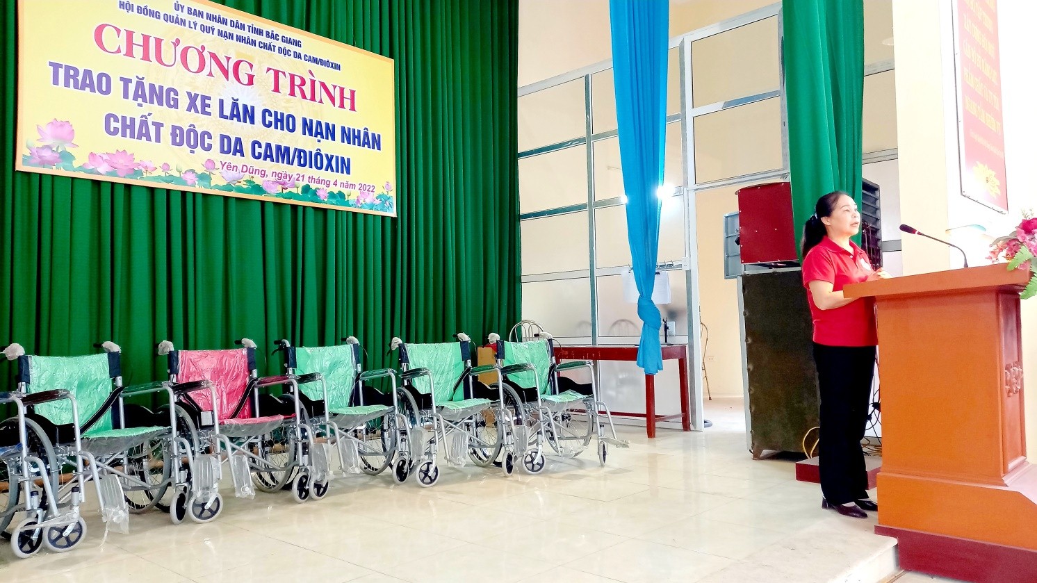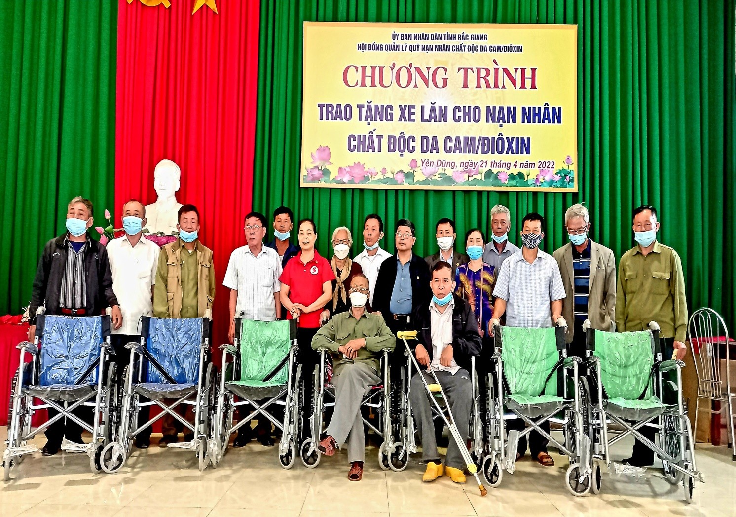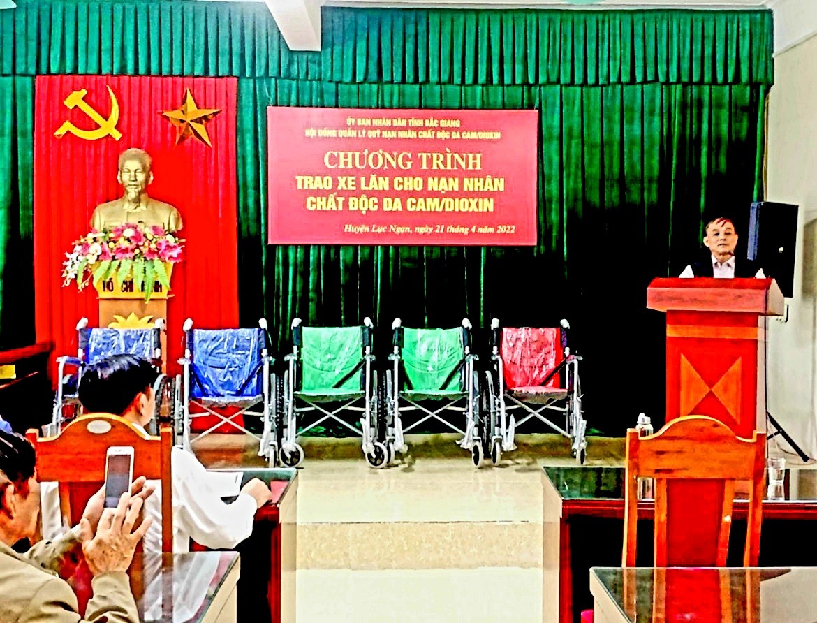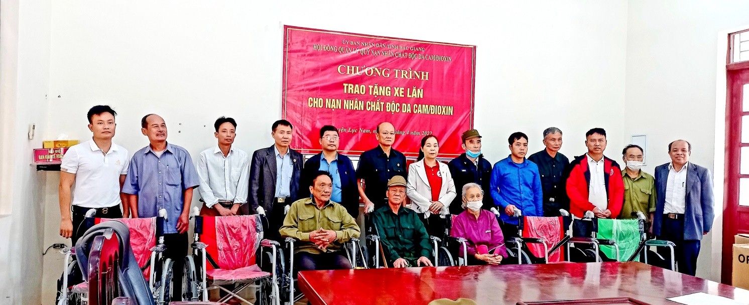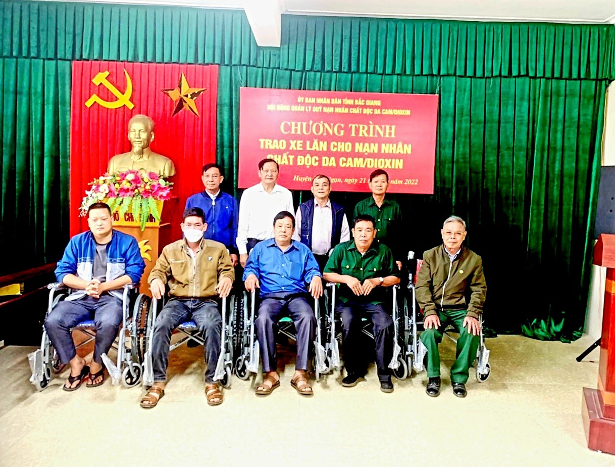 Ngày 21/4/2022, Thường trực Tỉnh hội và các thành viên Hội đồng quản lý quỹ Nạn nhân chất độc da cam/dioxin tỉnh tổ chức 2 đoàn đi thăm và trao tặng 20 xe lăn cho 20 nạn nhân chất độc da cam, hội viên bị liệt chân, tai biến mạch máu não hoặc khuyết tật vận động, tại các huyện: Lục Ngạn 5 xe lăn, Lục Nam 7 xe lăn, Yên Dũng 7 xe lăn và Yên Thế 1 xe lăn. Nguồn kinh phí mua xe lăn được trích từ Quỹ Nạn nhân chất độc da cam/dioxin tỉnh với tổng giá trị trên 70 triệu đồng. Loại xe lăn này có ưu điểm hình thức đẹp, chắc chắn, gập, xếp dễ dàng và đặc biệt xe lăn có phanh tay giúp người đẩy xe lăn phía sau tiện lợi, đảm bảo an toàn cho nạn nhân.