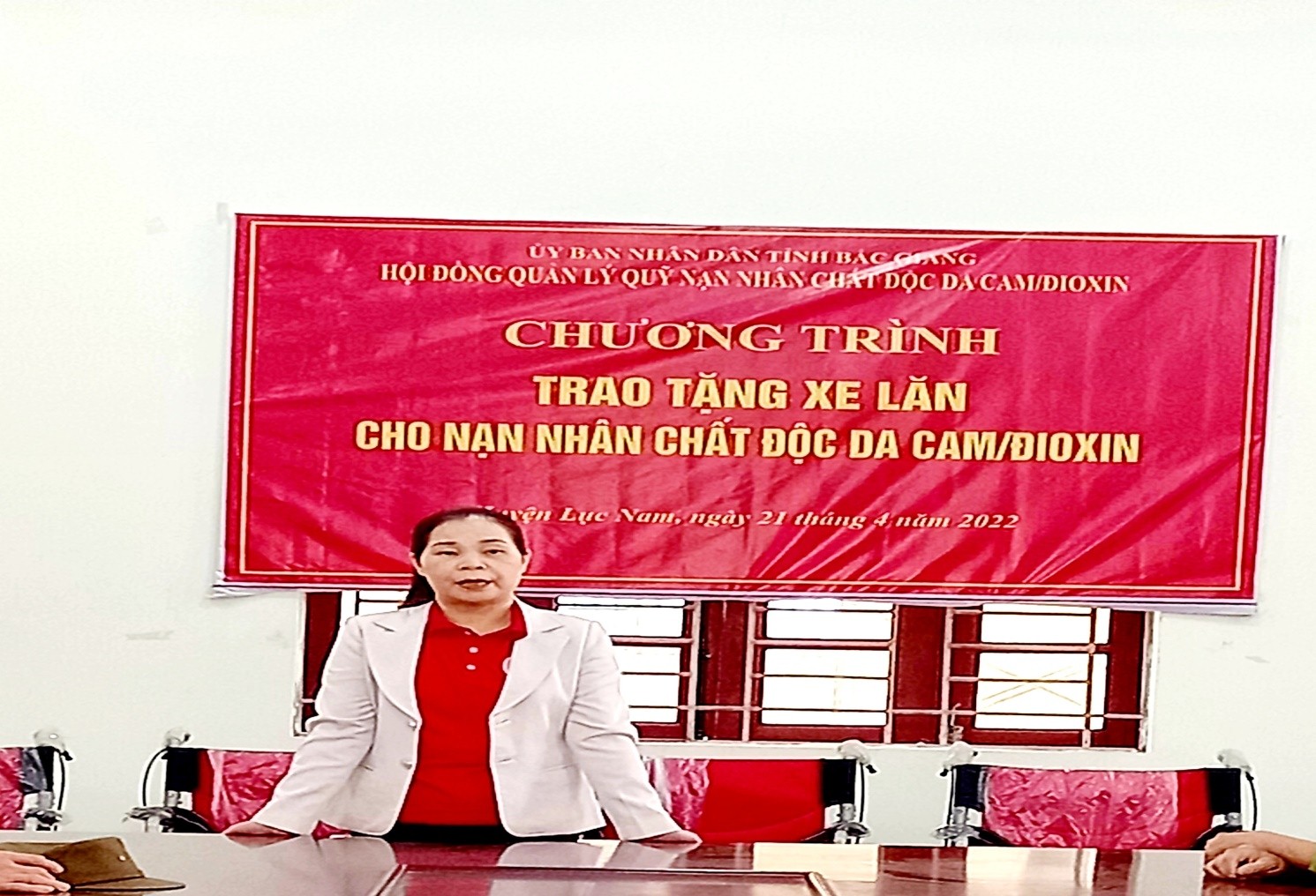 Ngày 21/4/2022, Ông Thân Văn Nhau – Chủ tịch Tỉnh Hội, Chủ tịch Hội đồng QL Quỹ NNCĐDC/dioxin tỉnh phát biểu ý kiến chỉ đạo chương trình tặng xe lăn cho các Nạn nhân chất độc da cam tại huyện Lục Ngạn