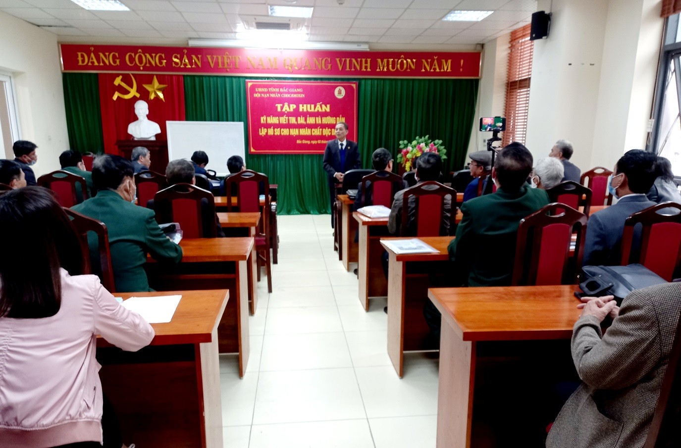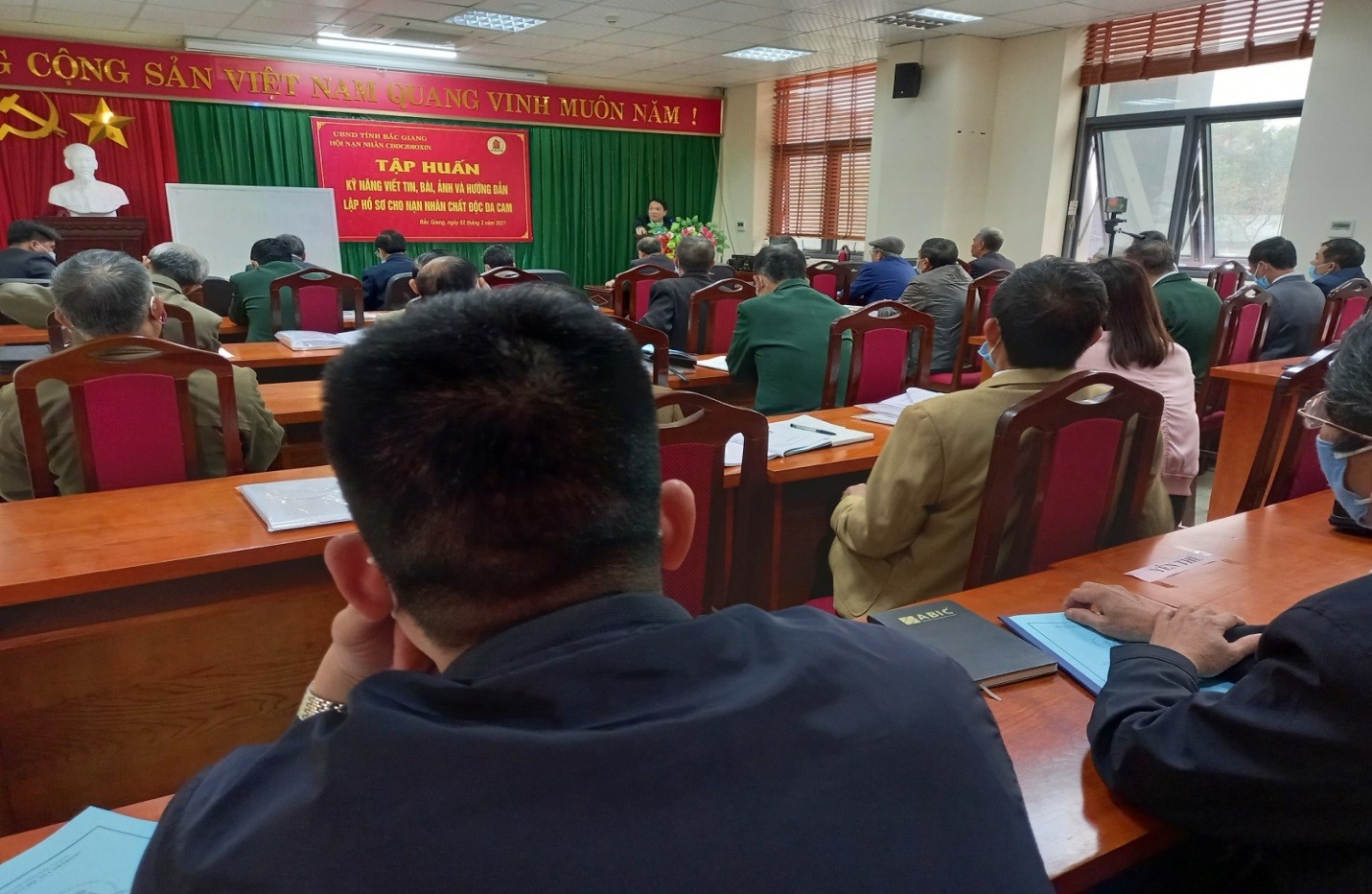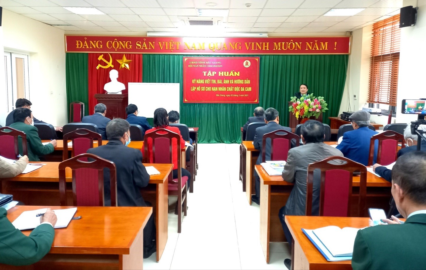 Thực hiện chương trình Kế hoạch công tác Hội năm 2021; Hướng tới kỷ niệm 60 năm Thảm họa da cam tại Việt Nam, ngày 02/3/2021, Hội Nạn nhân chất độc da cam/dioxin tỉnh Bắc Giang tổ chức Tập huấn kỹ năng viết tin bài, sử dụng ảnh và hướng dẫn lập hồ sơ nạn nhân chất độc da cam cho cán bộ chủ chốt các cấp Hội trên địa bàn tỉnh Bắc Giang. Dự lớp tập huấn có Thường trực tỉnh hội, cán bộ Tỉnh hội, các ông Chủ tịch, Phó Chủ tịch các huyện, thành phố, cộng tác viên và cán bộ chủ chốt cấp xã, phường, thị trấn trong tỉnh.