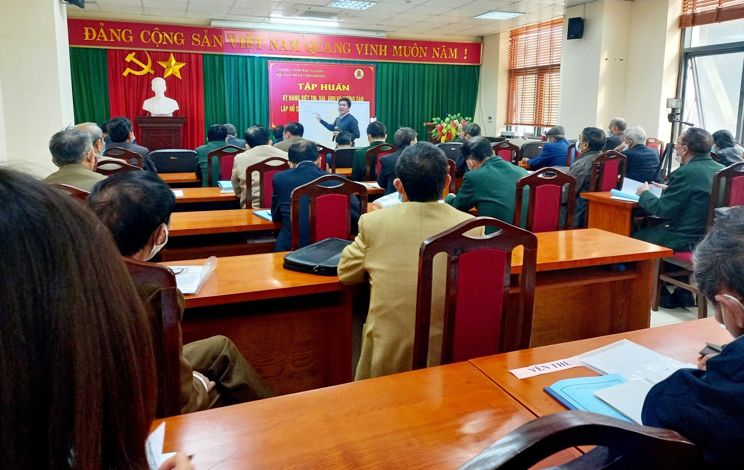 Ông Thân Văn Nhau, Chủ tịch Hội tỉnh, phát biểu khai mạc định hướng nội dung trọng tâm; bà Ma Thị Thìn Nga, Phó Chủ tịch Tỉnh hội báo cáo hoạt động của Trang thông tin điện tử Tỉnh hội Bắc Giang sau một năm thành lập; Lãnh đạo Phòng Người có công, thuộc Sở Lao động Thương binh và xã hội tỉnh và Phòng Cộng tác viên thuộc Báo Bắc Giang trực tiếp báo cáo trên lớp tập huấn.