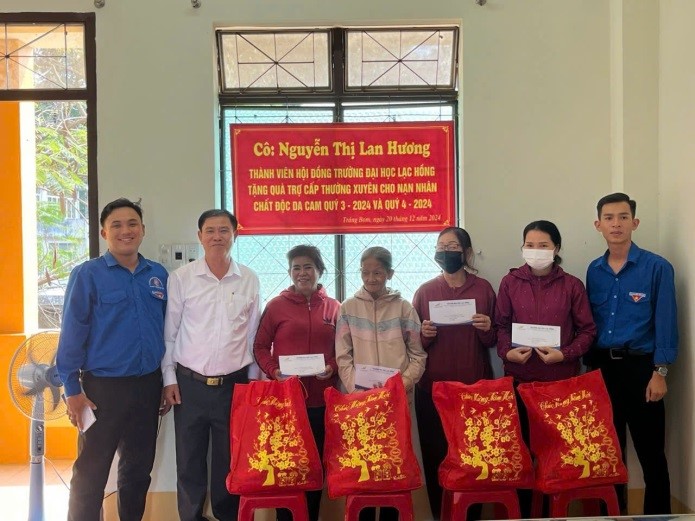 Ngày 20/12/2024, Hội Nạn nhân chất độc da cam/dioxin tỉnh Đồng Nai phối hợp với trường Đại học Lạc Hồng, Công ty TNHH Hương Nguyên, trao trợ cấp thường xuyên Quý 3 và 4/2024 cho 50 nạn nhân chất độc da cam ở 3 huyện: Trảng Bom, Cẩm Mỹ và Định Quán, với tổng số tiền 120 triệu đồng.