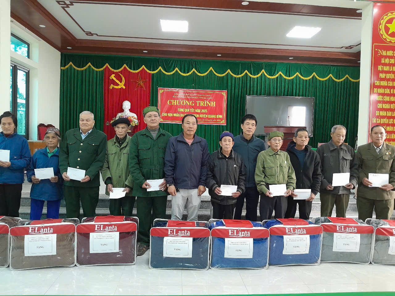 Hội Nạn nhân chất độc da cam/dioxin các cấp trong tỉnh Hà Giang đã tổ chức tốt đợt vận động tặng quà dịp Tết Nguyên đán Ất Tỵ - 2025 cho nạn nhân chất độc da cam trên địa bàn tỉnh. Tỉnh hội có Thư ngỏ kêu gọi các cơ quan, đơn vị, doanh nghiệp và các nhà hảo tâm trên địa bàn trong và ngoài tỉnh ủng hộ quà cho nạn nhân chất độc da cam dịp Tết Nguyên đán Ất Tỵ; đồng thời ban hành văn bản chỉ đạo các huyện, thành Hội triển khai vận động tặng quà Tết Nguyên đán Ất Tỵ cho nạn nhân chất độc da cam. Thường trực Tỉnh hội phối hợp với Hiệp hội doanh nghiệp tỉnh và các cơ quan, doanh nghiệp của tỉnh trực tiếp đi thăm và tặng quà cho nạn nhân chất độc da cam ở các huyện, thành phố trong tỉnh. Đồng thời chỉ đạo các huyện, thành Hội phối hợp chặt chẽ với các ban, ngành cùng cấp tổ chức thăm hỏi tặng quà cho nạn nhân trên địa. Nổi bật trong đợt vận động, tặng quà Tết Nguyên đán Ất Tỵ có: thành phố Hà Giang; các huyện: Vị Xuyên, Bắc Quang, Quang Bình, Hoàng Su Phì và huyện Xín Mần.