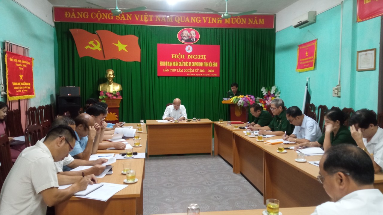 Phối hợp với Đài Phát thanh và Truyền hình tỉnh, huyện, Tạp chí Da cam Việt Nam, Báo Hòa Bình kỷ niệm 77 năm Ngày Thương binh - Liệt sỹ (27/7/1947-27/7/2024), 63 năm Thảm hoạ da cam ở Việt Nam (10/8/1961-10/8/2024). Tích cực vận động, thăm hỏi, tặng quà, tặng nhà, xe lăn, cấp phát thuốc miễn phí cho nạn nhân chất độc da cam và gia đình nạn nhân, dịp ngày Thương binh liệt sĩ (27/7) và tổ chức gặp mặt nhân ngày Vì nạn nhân chất độc da cam Việt Nam (10/8). Đẩy mạnh phong trào thi đua Vì nạn nhân chất độc da cam; vận động nguồn lực chăm sóc giúp đỡ nạn nhân. Xây dựng kế hoạch, lập dự toán kinh phí năm 2025, kinh phí đăng cai tổ chức Hội nghị trao đổi kinh nghiệm công tác của 26 tỉnh, thành phố phía Bắc vào Quý II/2025 báo cáo UBND tỉnh. Tổng kết công tác Hội năm 2024./.